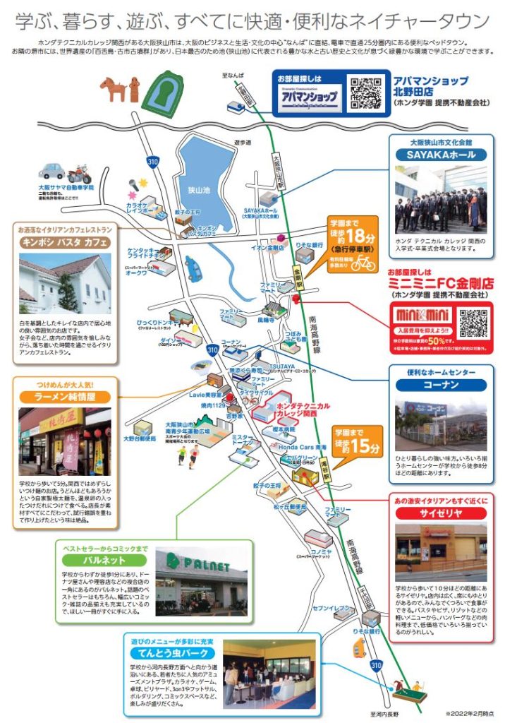 ホンダテクニカルカレッジ関西がある大阪狭山市は、「学ぶ、暮らす、遊ぶ」すべてに快適・便利なネイチャータウンです。大阪の生活・文化の中心地「なんば」からも、乗り換えなしで電車で23分程度。また、今回は新たに学園周辺にある生活に便利なお店情報(飲食・ホームセンター・教習所・不動産・余暇等)のMAPを制作しました。