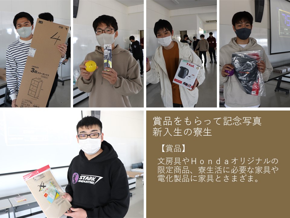 4月10日(土)学園の講堂にて、新入生の寮生を対象としたイベント「くみの木寮 歓迎会」を寮の指導生で実施しました。まずは、寮の先輩になる指導生からイベントの趣旨を説明し、新寮生同士の交流、新寮生や指導生との交流、更に豪華賞品が当たるゲーム大会等をしました。Hondaグッズや家電製品があたるイベントでは大いに盛り上がっておりました。