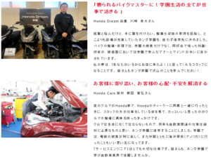 今回は「本田技研工業(株)=Honda」、「Honda Cars 泉州(四輪サービスエンジニア)」、「Honda Dream 鈴鹿(二輪サービスエンジニア)」、「東京海上日動火災調査サービス(損害保険アジャスター)」で活躍している4名の卒業生に、ホンダ学園を進学先に決めた理由、学園時代の思い出、今の目標について語っていただきました。