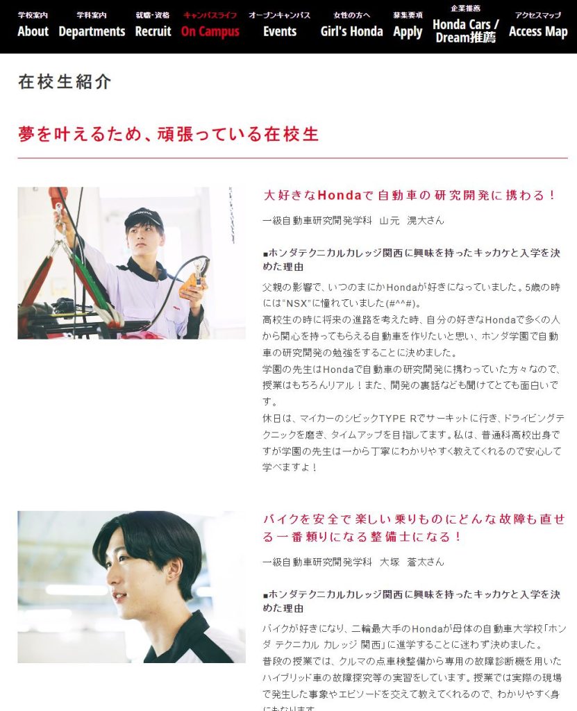 【更新!】学園生の紹介コーナー 2023.12.05 新たに在校生紹介コーナーに学生を3名新規掲載しました。自動車の研究開発者になりたいため、一所懸命頑張っている「一級自動車研究開発学科 自動車研究開発コース」3年生の山元さん、大好きバイクの同好会活動を積極的にしている一級自動車研究開発学科2年生の大塚さん、そして、2024年4月入学予定の大塚さんの3名となります。 ■在校生紹介コーナー(下記画像をクリックすると遷移します) ■Girl’s Hondaコーナー(下記画像をクリックすると遷移します)