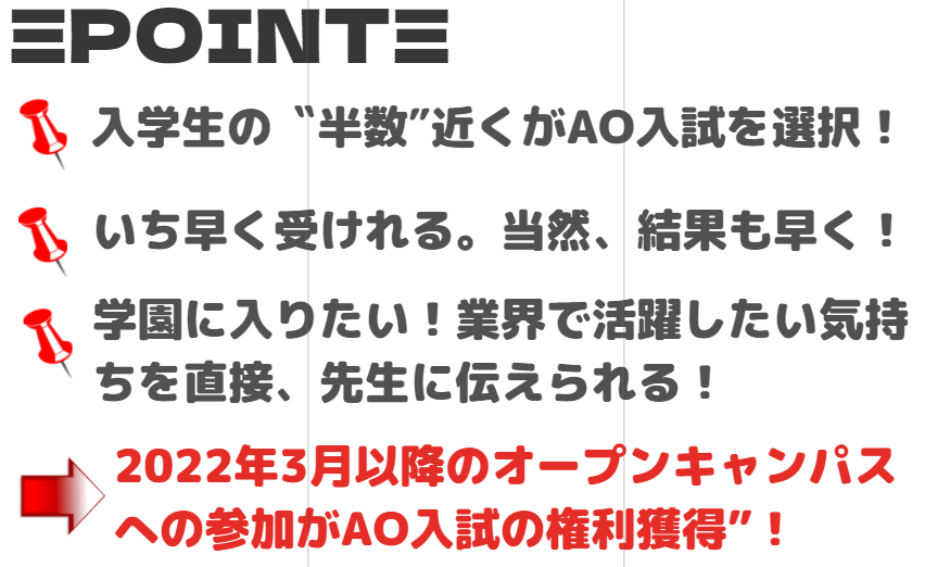 ご入学する方の半数近くがご利用されているAO入試。ぜひ、ご検討ください。