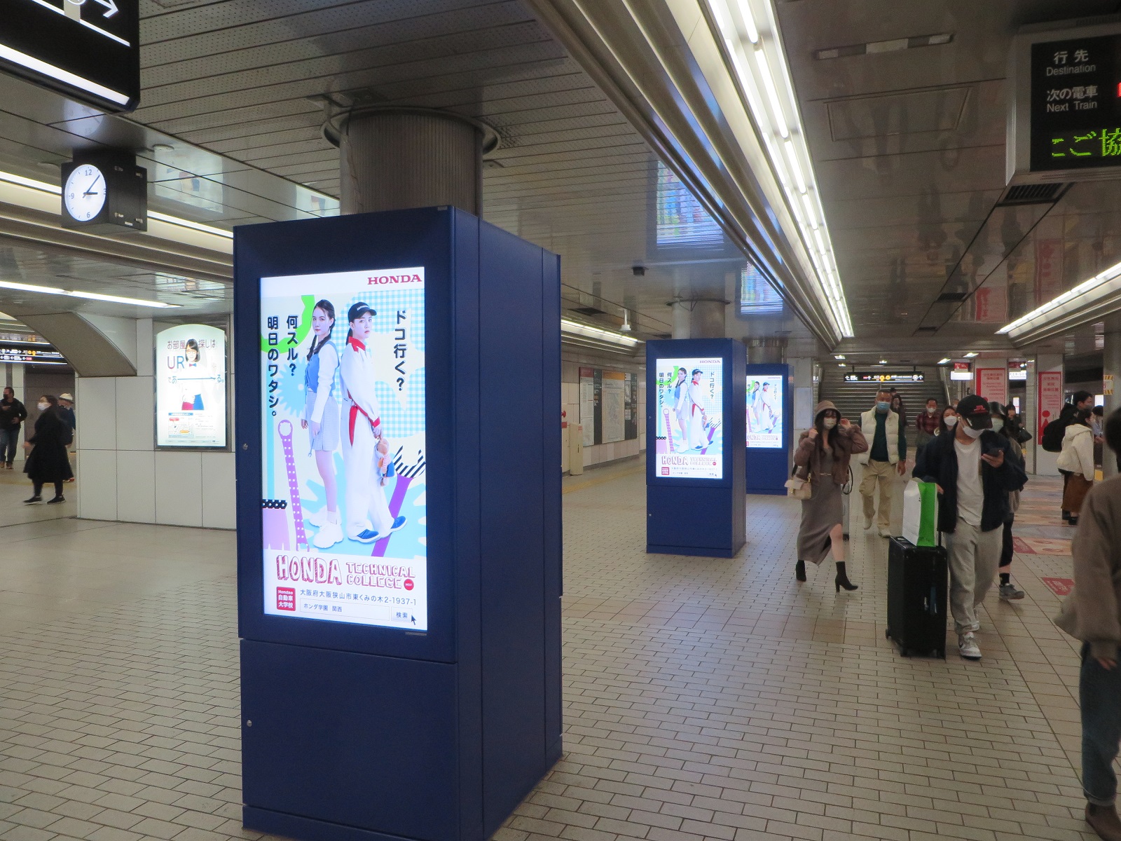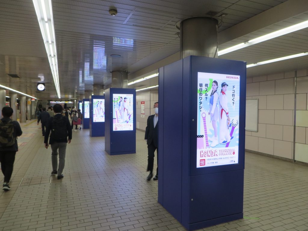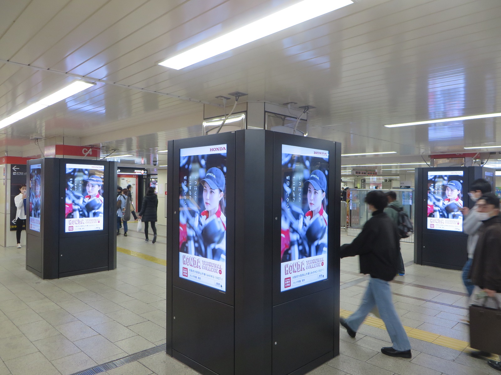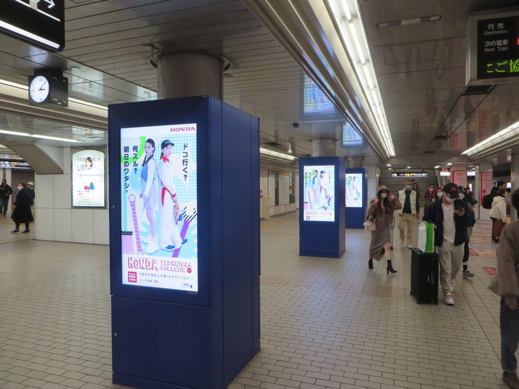 【梅田・なんば 駅de】駅のサイネージを使った動画広告スタート! 2022.11.21 大阪の駅の乗降人数が圧倒的に多い『梅田』と『なんば』の駅(2つの駅の乗降人数は約60万人/日)に設置されているデジタルサイネージで、ホンダテクニカルカレッジ関西の動画を11月21日から12月4日まで放映します。期間中は、駅構内で本校の動画がたくさん流れますので、多くの人が見てくれると思います。(^^♪。 ■梅田となんばの駅構内の様子 世界に歓迎されるエンジニアを育成する。それがホンダ学園の建学の精神です。
