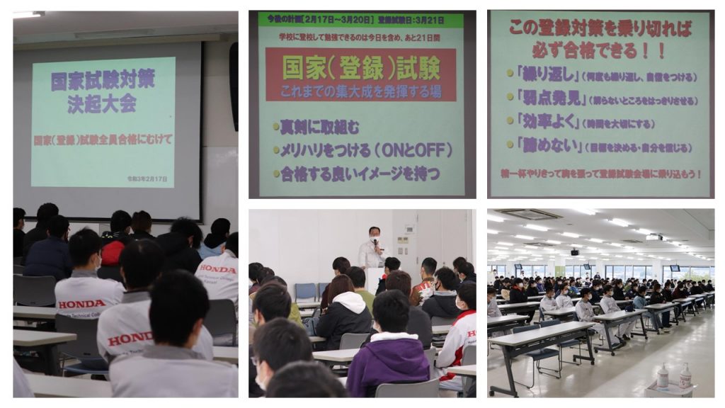 2月17日(水)に3月に行われる国家資格試験「二級自動車整備士」の全員受験・全員合格に向け決起大会を開催しました。今回は、自動車整備科2年生、一級自動車研究開発学科2年生、自動車研究開発科3年生、自動車整備留学生科3年生の総勢139名がチャレンジします。また、決起大会は、多くの学生が集まることから、席の間隔は空け、コロナウイルス感染対策を徹底した上で実施しました。学園に登校して勉強できる日数は残り、21日。受験するクラスの担任の先生から激励の言葉を受け、学生たちの顔つきが少し変わったように感じました。