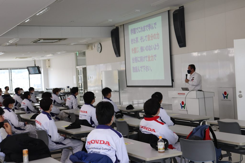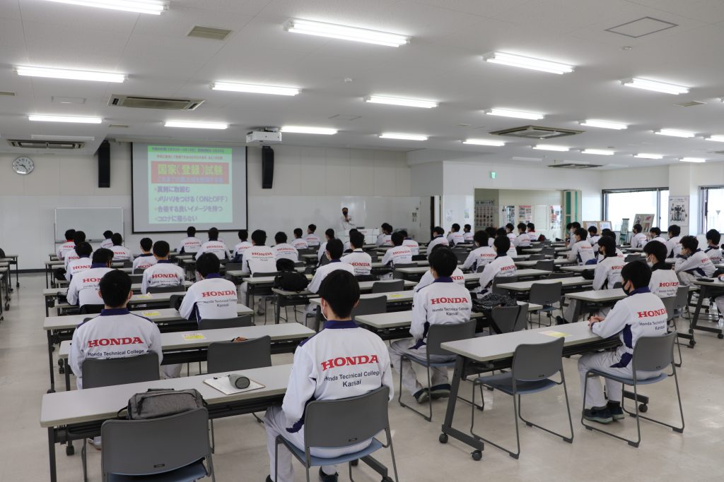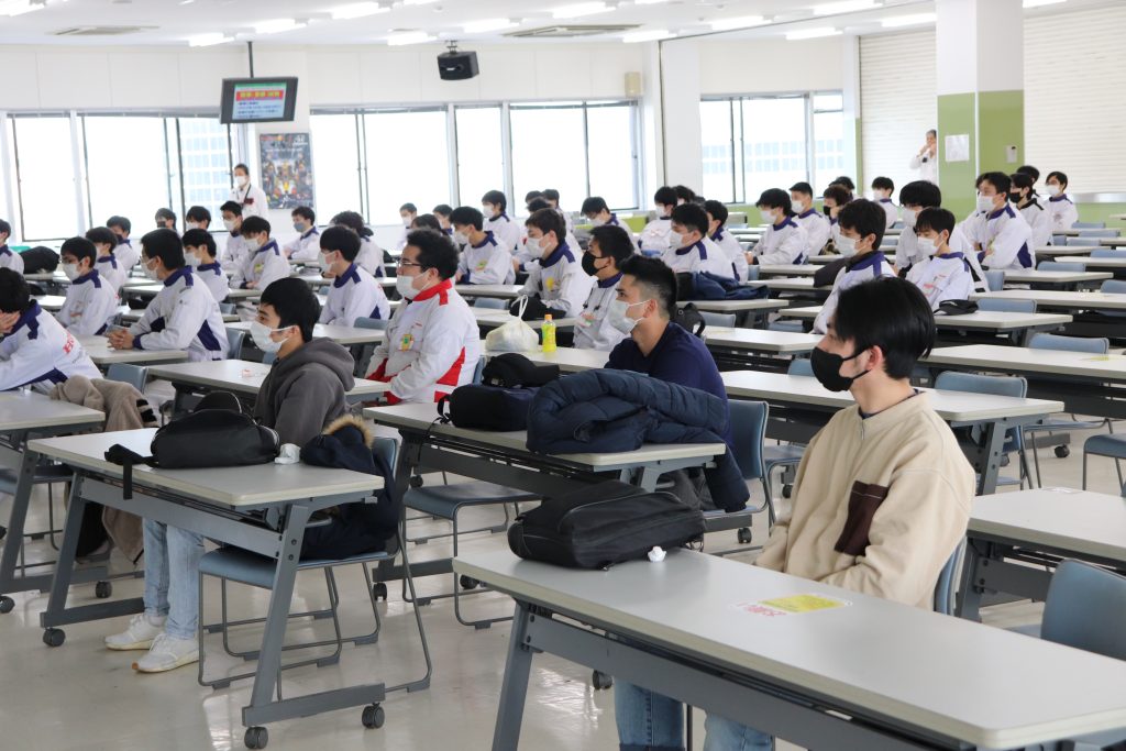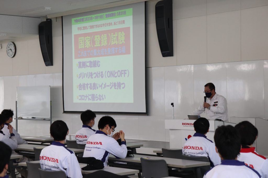 2月23日(水)に3月に行われる自動車整備士の国家資格試験(以下登録試験)の全員受験・全員合格に向けての決起大会を講堂にて行いました。登録試験は、これまで勉強してきたことを発揮する大事な一日となります。コロナ禍での開催となることから、まずは、しっかり自身の体調管理をして登録試験に臨むこと、そして、自身の力を最大限発揮することです。みんな、ファイト!