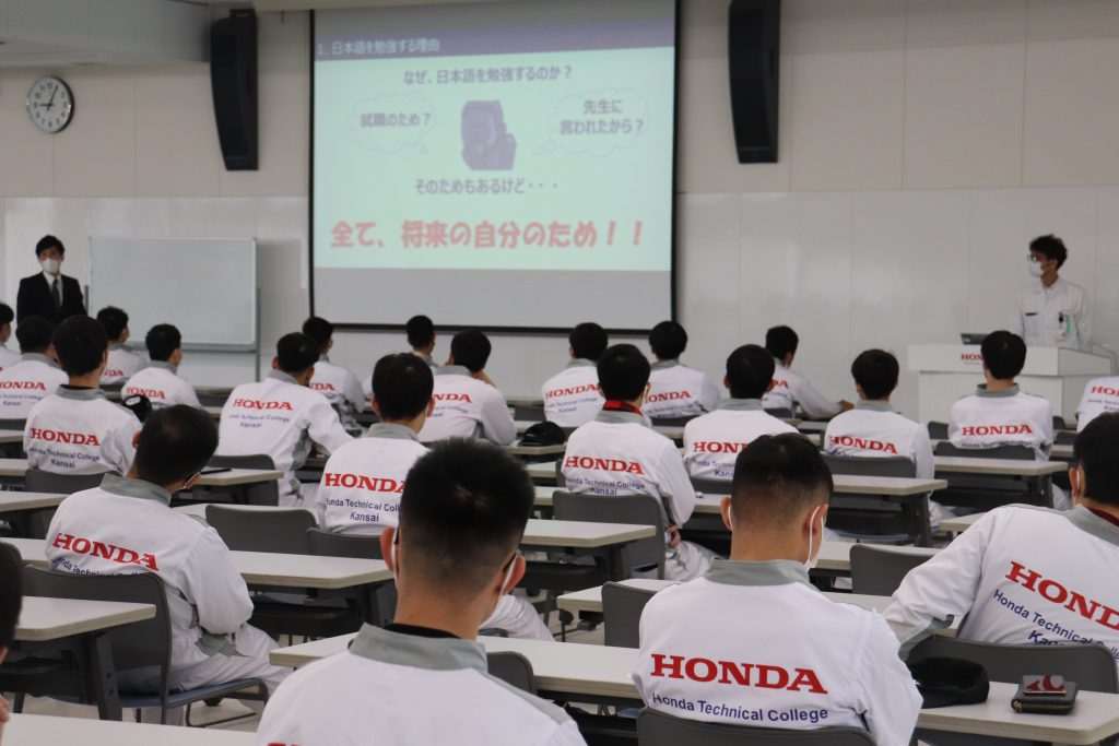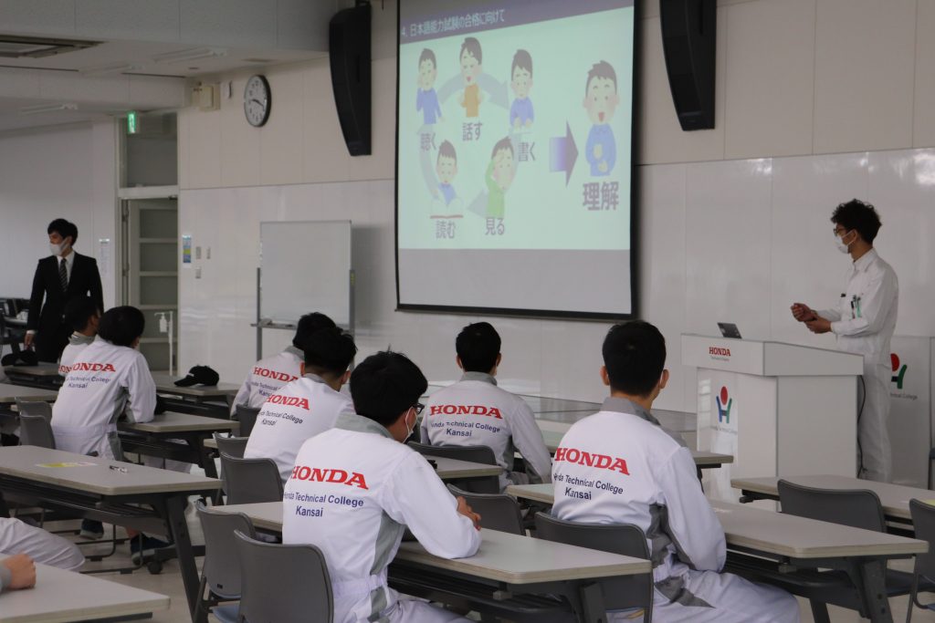12月1日(水)講堂にて、自動車整備留学生科1年生74名で今週末に行われる日本語能力試験(JLPT)に向けた決起集会を開催いたしました。留学生にとっては、自動車の知識、整備スキルを身に付けることはもちろんですが、日本で就職、活躍するためには日本語能力も向上させなければなりません。