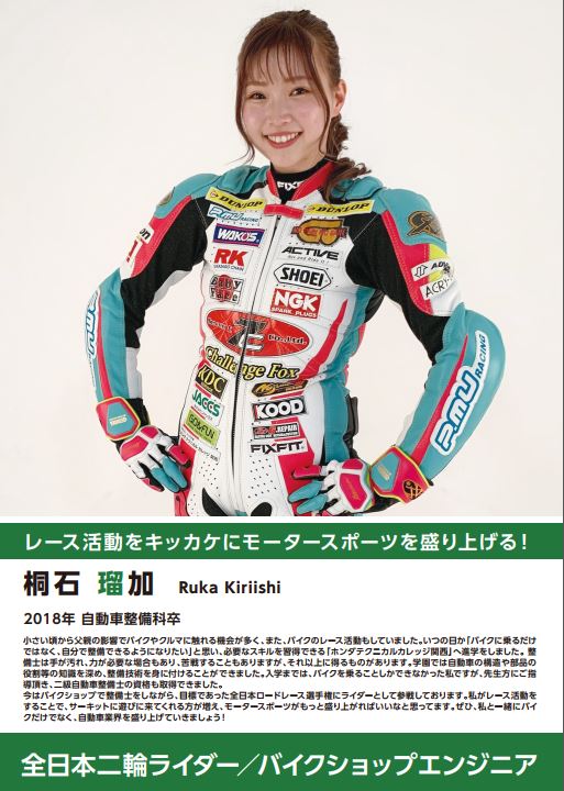 本校の卒業生で且つ、全日本の2輪ライダーとしても活躍している桐石 瑠加選手が7月30日(土)の夏の体験授業に来てくれます。当日は桐石選手とのトークショーを予定をしております。