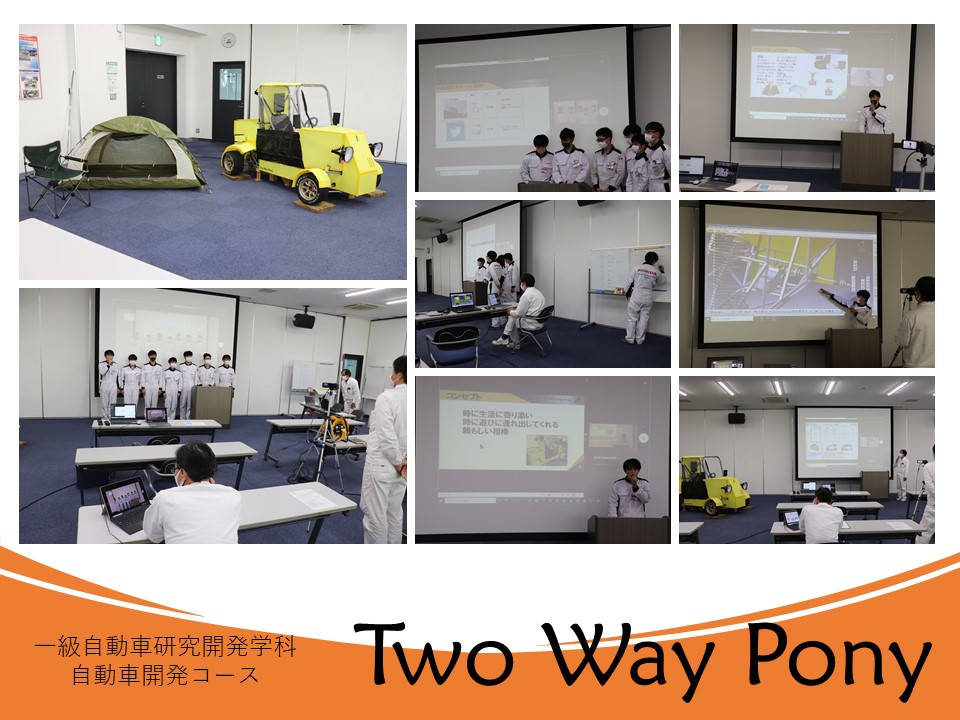 自動車研究開発コースの製作車両の名前は「Two Way Pony」=2通り使える、荷物が運べる馬(ポニー)。コンセプトは『時に生活に寄り添い、時に遊びに連れ出してくれる頼もしい相棒』です。買い物に行ってもたくさんの荷物が詰めるし、キャンプに行くときには、必要なテント、椅子、調理器具を積んでも走れる耐荷重を計算して製作を考えております。