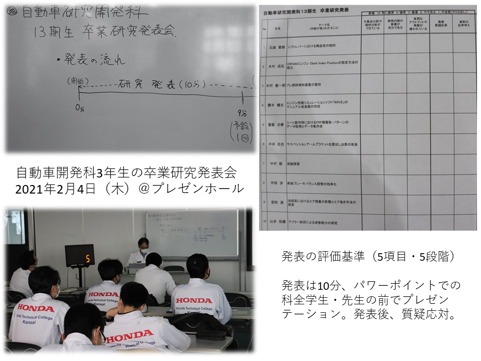 2月4日(木)に自動車開発科3年生10名の卒業研究発表会を実施しました。発表は、科の学生と先生の前で10分という限られた時間で取り組み内容をそれぞれプレゼンテーションする形。夜遅くまで頑張っていた姿、上手くいかず悩んでた姿、先生や仲間に協力やアドバイスを求めたりして、なんとか今日の発表を迎えました。発表した学生は立派に自身が取り組んだ研究発表ができたと思います。学園で学んだ3年間、仲間と切磋琢磨し、お互いに成長できたのではないでしょうか。卒業まで残り1か月、4月からは社会人。残された期間、充実した学園生活を送ってください。