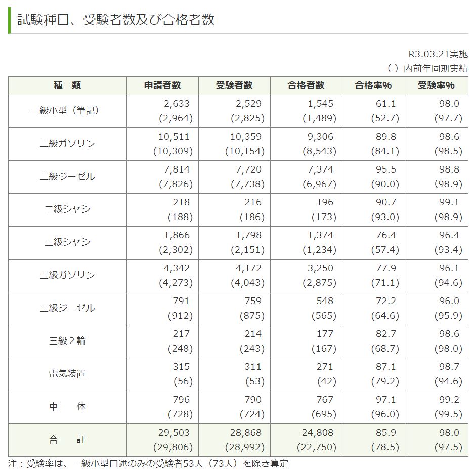 ●一級小型自動車整備士 :受験者数29名 合格者29名 *2021年5月9日実施の口述試験も29名全員合格