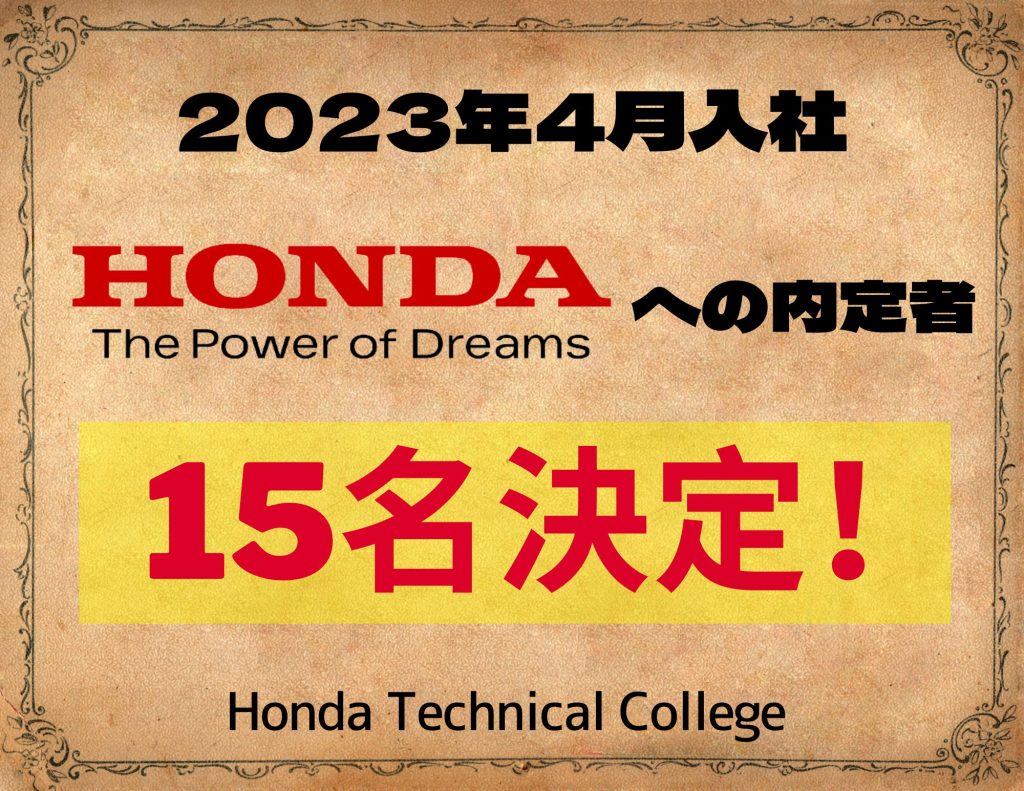 2023年4月入社の本田技研工業(株)=Hondaへのホンダ学園からの内定者が決定しました。2023年4月の内定者は15名です。コロナ渦で、Hondaや大手企業の新卒採用が大幅に見直しされる中での15名の内定、価値ある実績です。国立大学や有名私立大学に並び、毎年、Honda への内定者がトップレベルのホンダ学園!