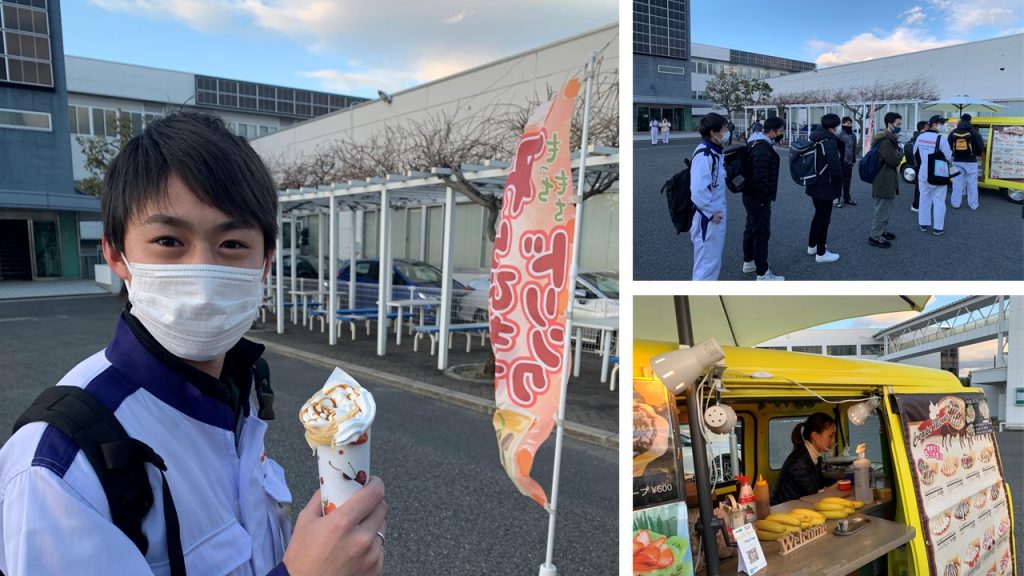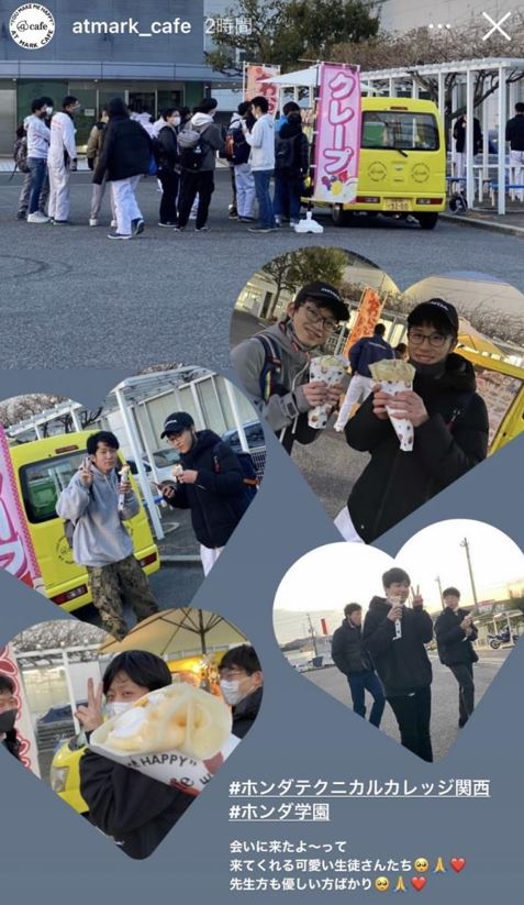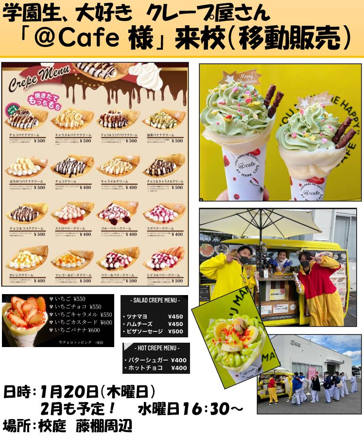 11月の学園祭にもキッチンカーで出展していただいたクレープ屋さん「atmark_cafe」さんが再び来てくれました。放課後になると、すぐにキッチンカーの前には列が。学生・教職員とも甘いものが大好きみたいです。学生・教職員のホッコリするひとときをご提供していただけました。「atmark_cafe」さん、いつもありがとうござます。今後も定期的に学園に来てくれるとのことでした。
