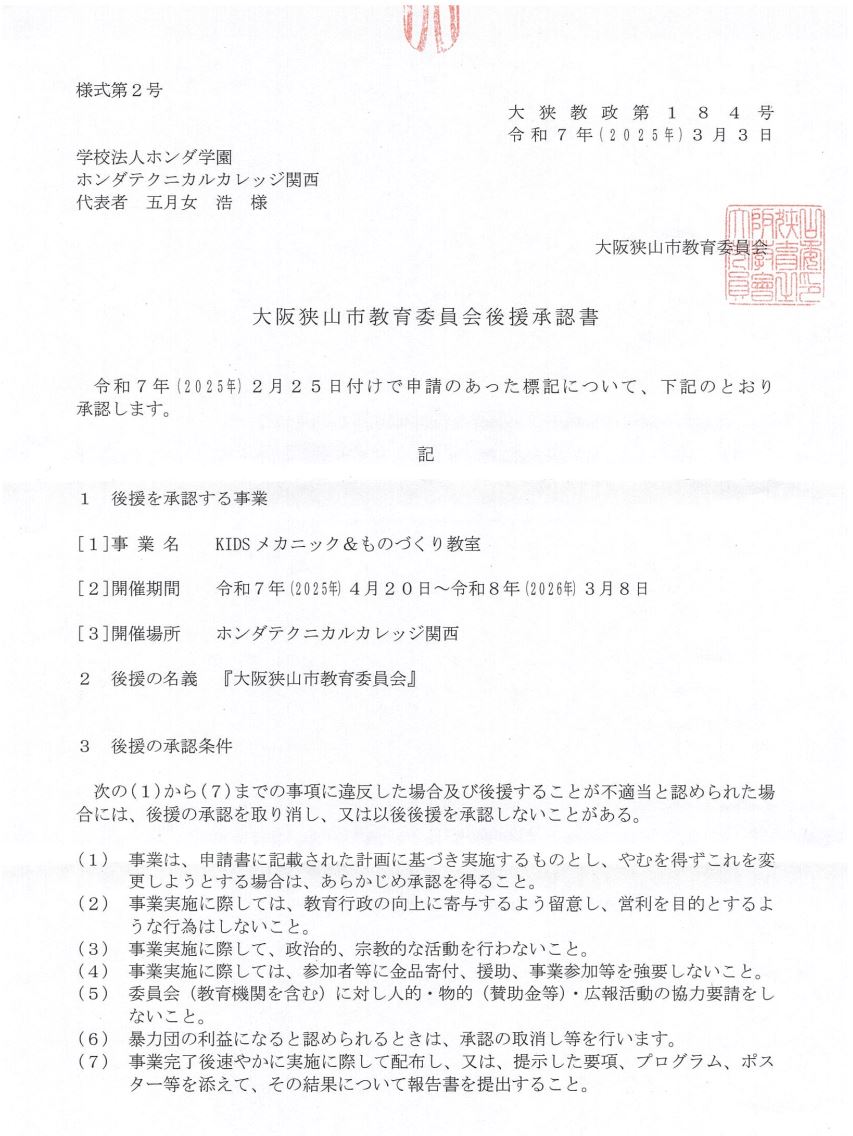 2021年度より開催している小学生対象の【KIDSメカニック&モノづくり体験授業】が、2025年度も大阪狭山市 教育委員会から後援をしていただけることになりました。