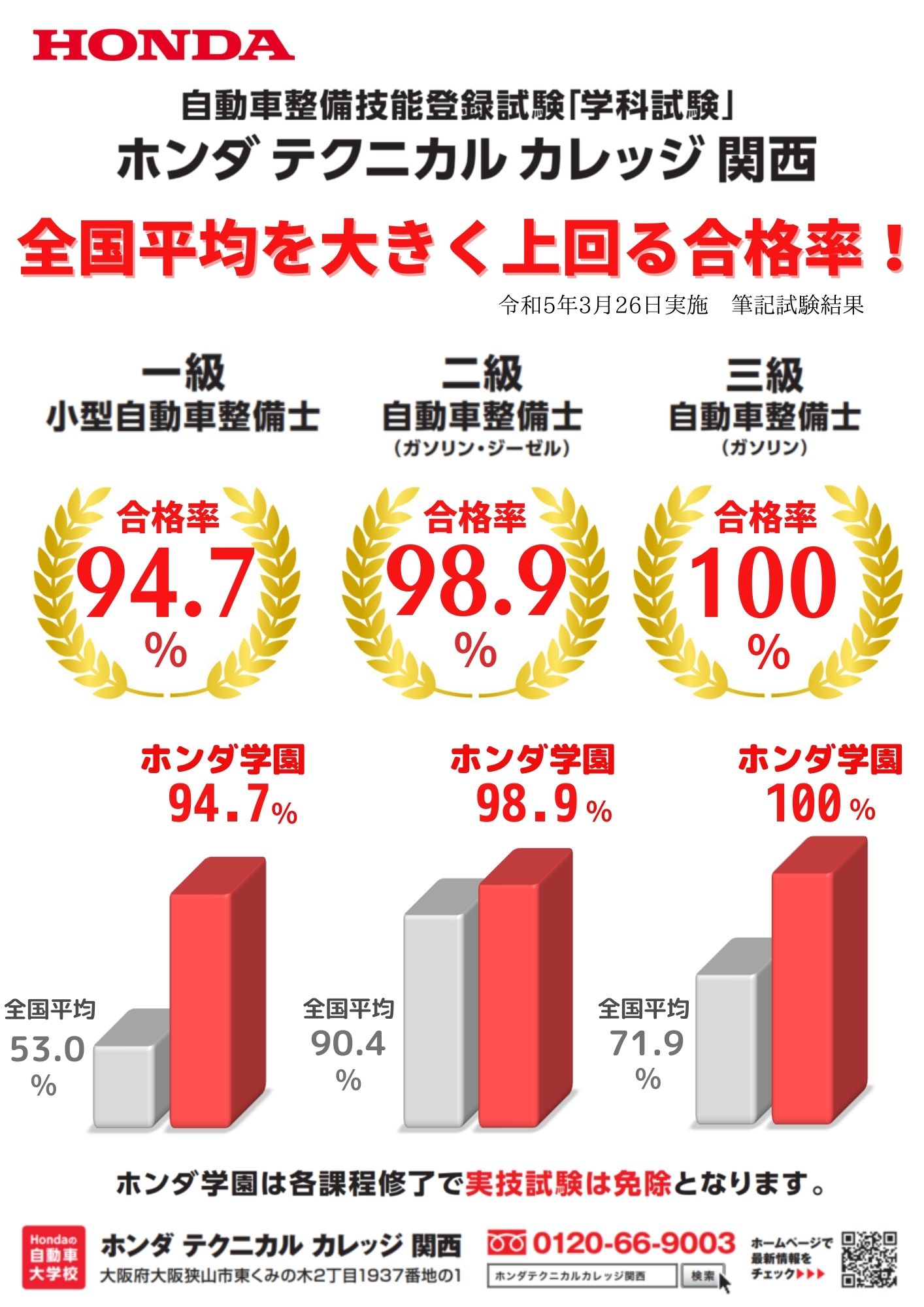 ホンダテクニカルカレッジ関西 受験者196名 合格者194名 合格率98.9%(全国平均:90.4%)