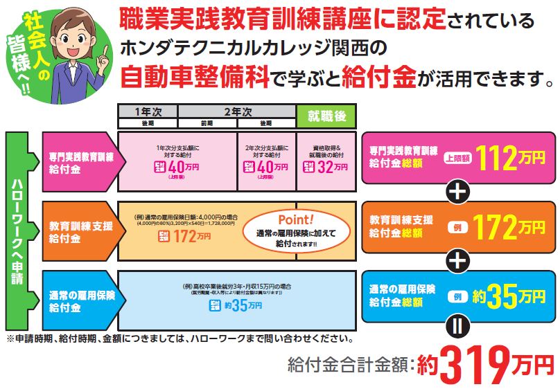 ホンダテクニカルカレッジ関西校の自動車整備科(2年課程)は、厚生労働省より教育訓練給付金の対象となる「専門実践教育給付金指定講座」に認定されております。社会人の方・社会人だった方の学び直しに、国(ハローワーク)が支援してくれる制度です。自動車業界で活躍してみたい方は、ぜひこの制度を利用してホンダ学園で二級自動車整備士資格を取得しませんか。