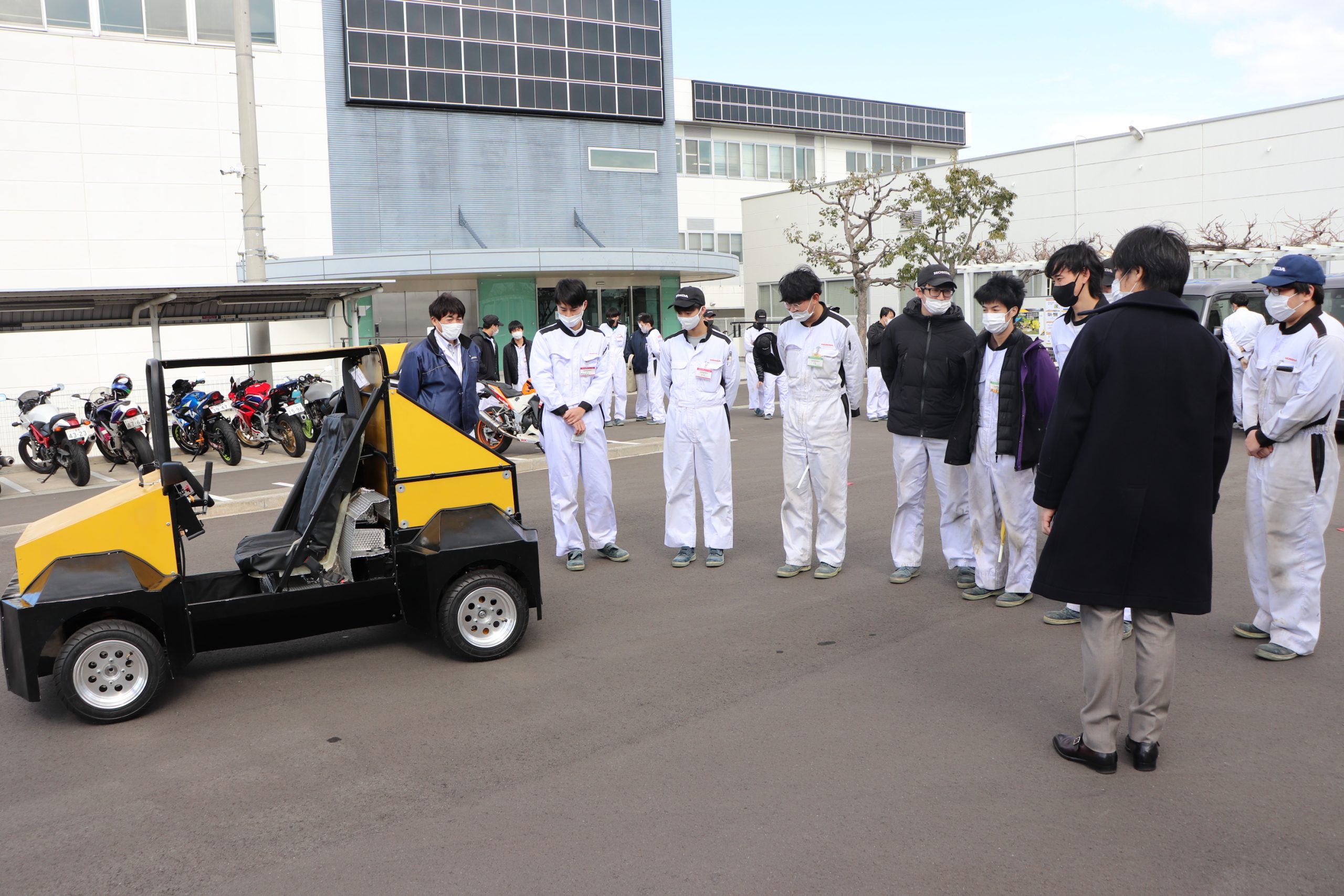 講義後は、自動車研究開発コース4年生が制作したクルマを実際に見て・乗っていただき、講評もしていただきました。