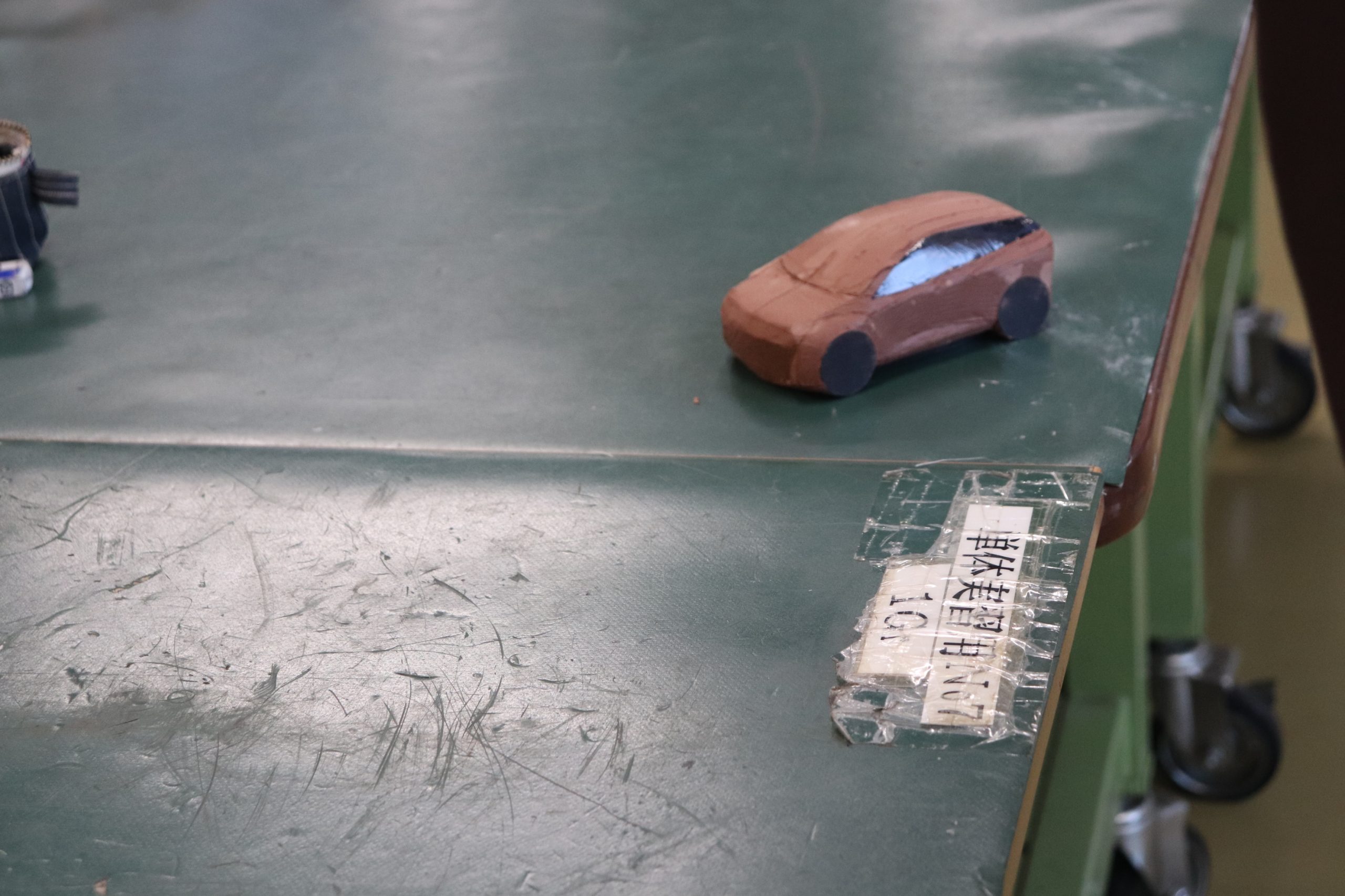 ※クレイモデルとは、工業用の粘土で形状を作るデザインモデルのこと。主に自動車の形状を検討する際に作られます。外側の見た目や内装はもちろん、空力や使用感などの検討を行うこともできる。クレイモデルは、はじめから人の手作業で形作るのではなく、始めに3Dデータを作成して切削機械でおおよその形に削り出し、様々な工具を使って調整することが一般的です。その後、クレイモデルの上からフィルムの貼り付けや塗装を行うことにより、ボディのカラーや質感などを再現します。