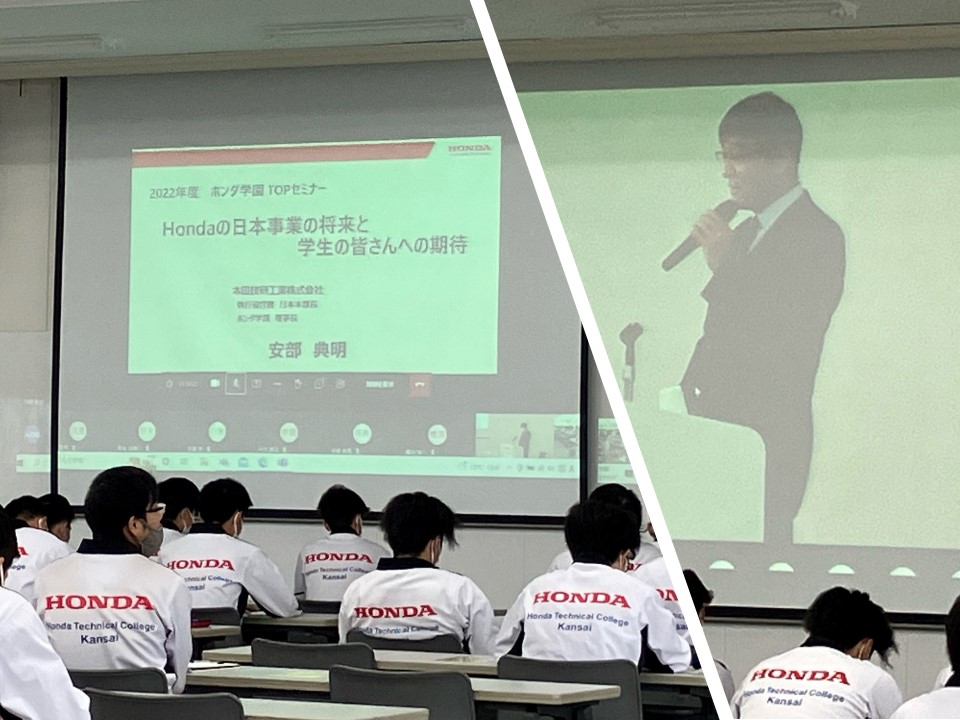 11月1日(火)に本田技研工業(株)執行役常務の安部典明さんを姉妹校の関東校にお招きし、TOPセミナー※を開催しました。安部さんはホンダ学園の現理事長でもあります。今回の講話内容は「Hondaの日本事業の将来と学生の皆さんへの期待」と題して、約1時間半の講話および質疑応答を行いました。
