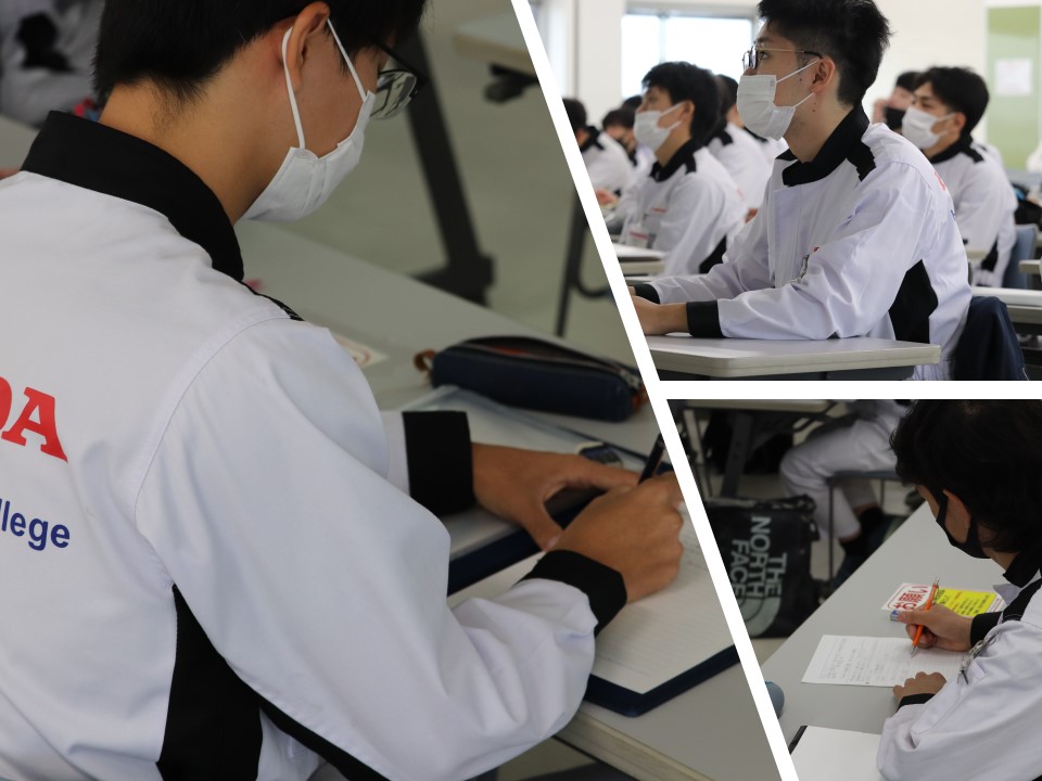 日頃、なかなかお話しすることができない方とあって、学生は真剣な眼差しで講話に耳を傾け、メモを取り、質問事項をまとめていました。安部さんはHondaの将来の展望に学園生に期待することをわかりやすく語ってくれ、学生も教職員もモチベーションが更に上がった日となりました。今回は質疑応答の時間を長く取っていただいたことで、多くの学生が質問・意見をすることができました。また、質問や意見について丁寧にご回答していただき、誠にありがとうございました。