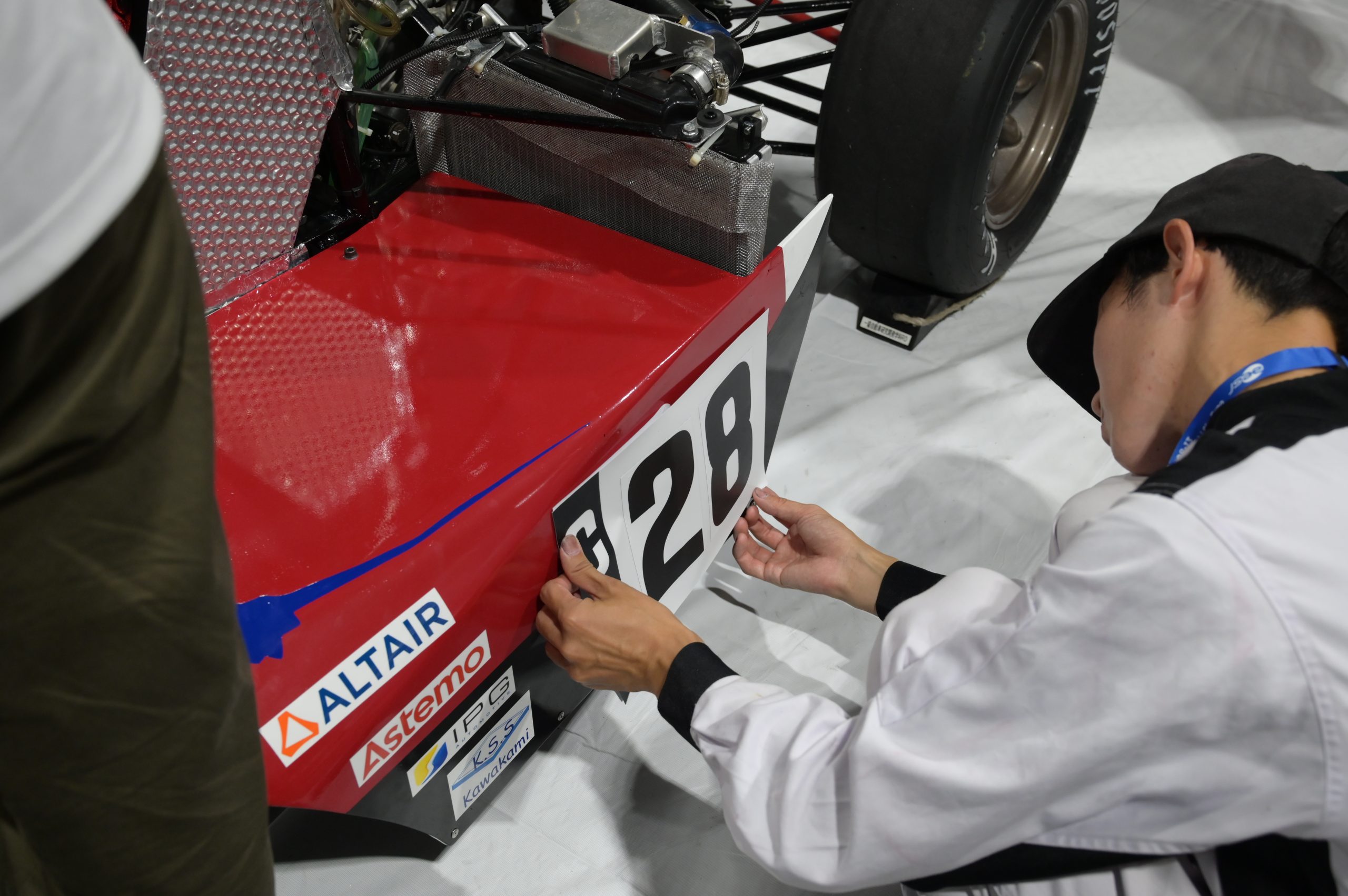 会場についてすぐにピットの設営を行い、その後、車両の静的車検を受けました。車検での指摘項目は昨年より厳しく、他チーム含めて小傷のあるマグネシウムホイールについては、ほぼ使用不可となりました。