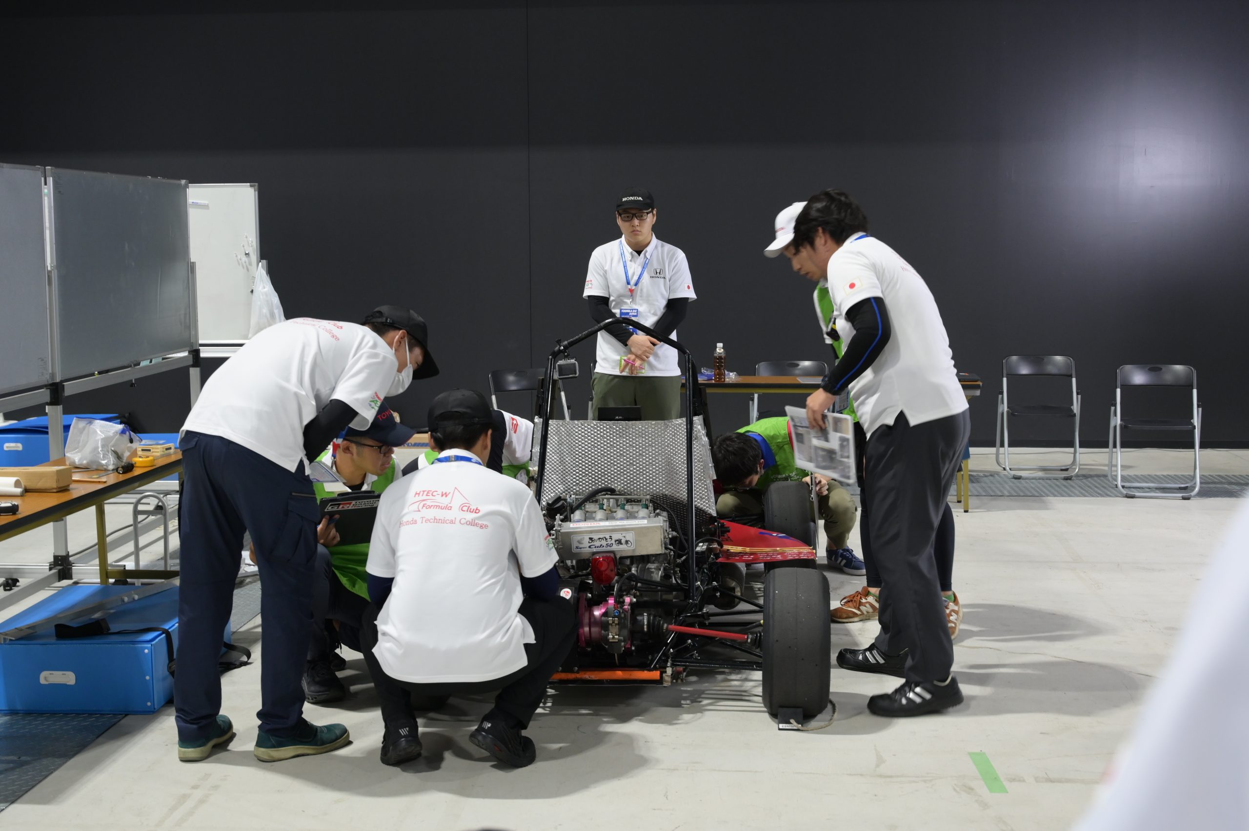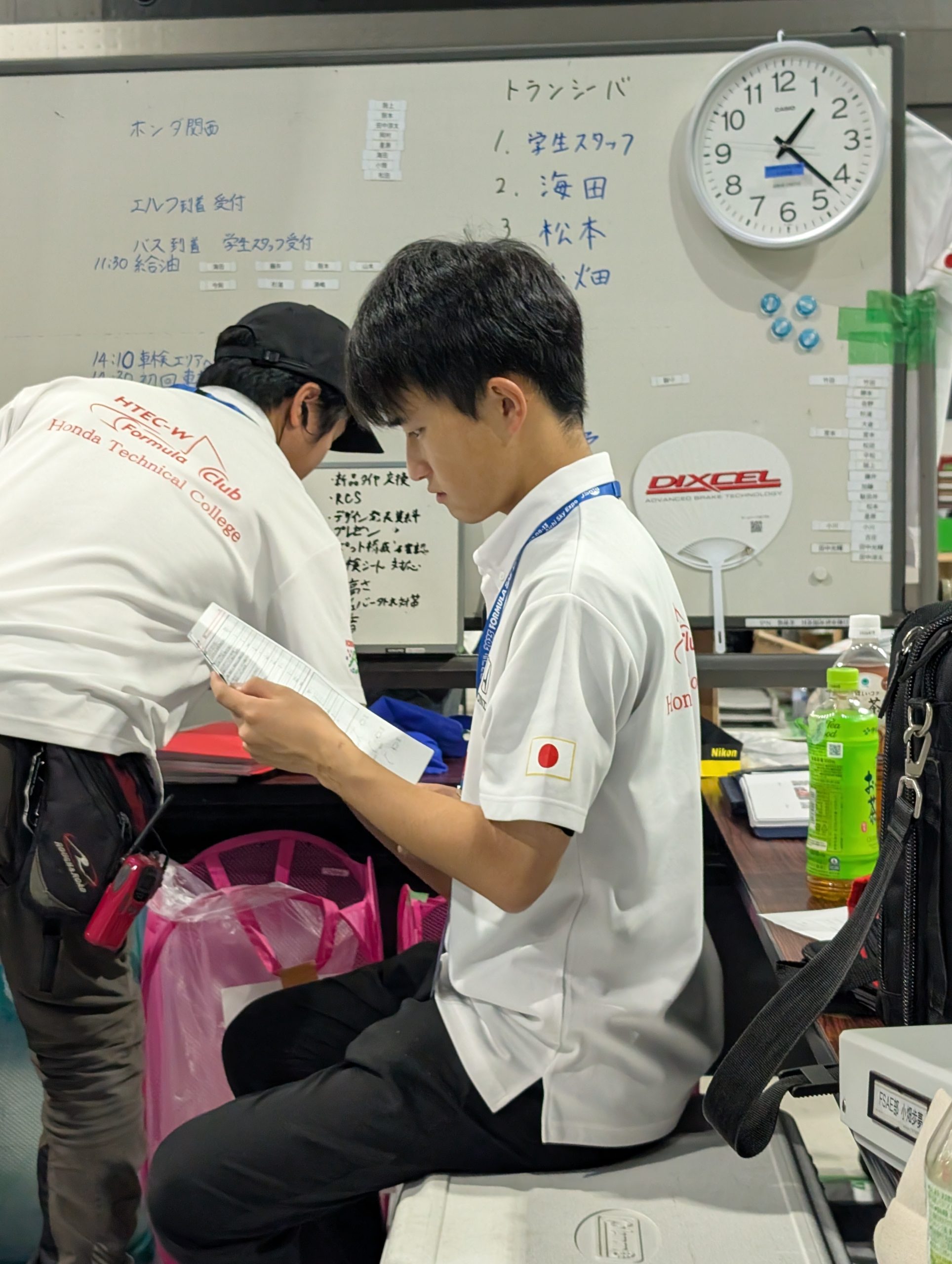 本校の持ち込みマグネシウムホイール8本も使用不可となり、走行できるホイールが無くなったため、急遽、教員と学園生数名がホイールを学園まで取りに帰りました。現場に残った学園生はその他の指摘項目対応を実施しました。また、学園にホイールを取りに行った学園生も当日中に現地ホテルにチェックインすることができました。初日から様々なことに対応しなければいけない日となりました。