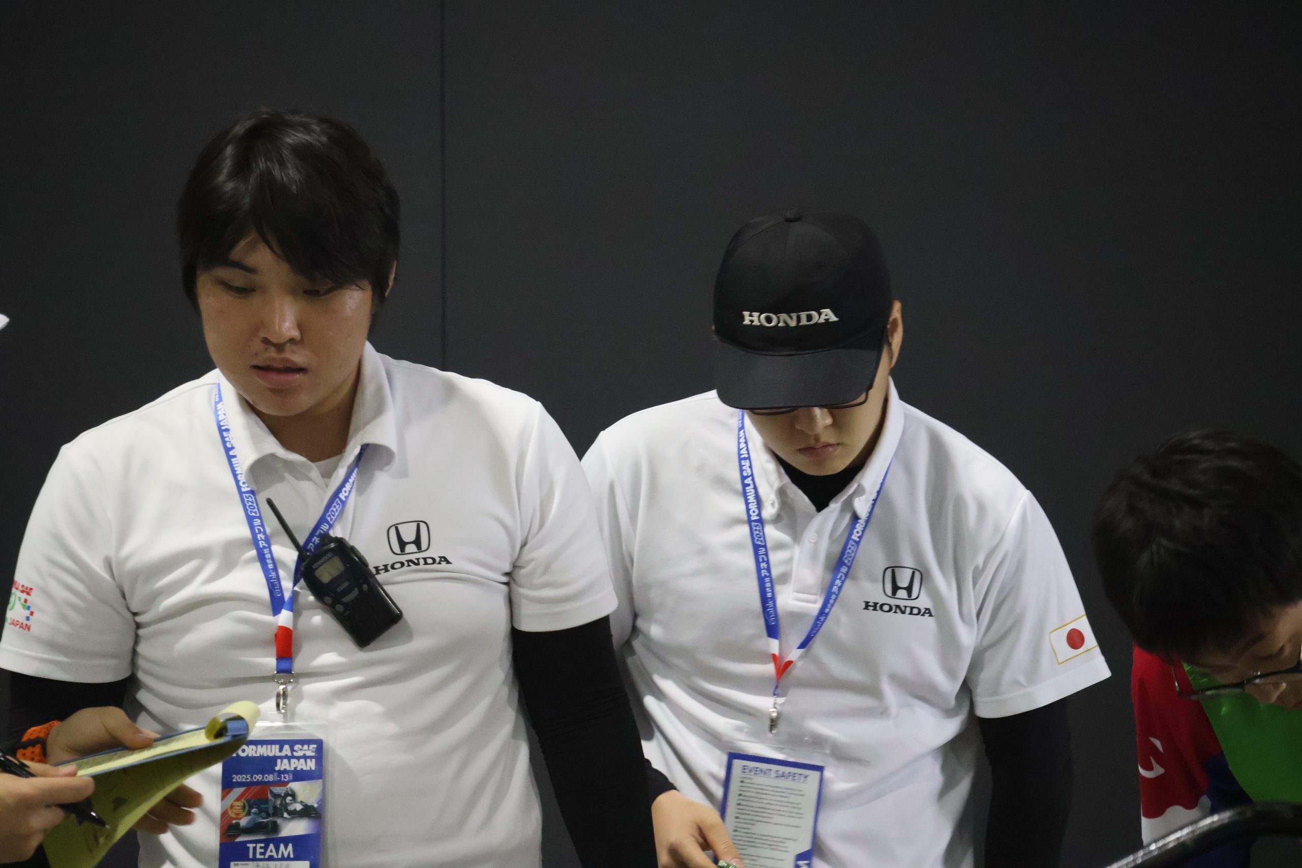 7時にピットがオープンし、午前中にデザイン審査・コスト審査・静的車検の残項目再車検をし、全項目合格しました。午後からは、ドライバー試験(登録ドライバー全員合格)・重量測定・チルト試験(60度傾きNG→車高調整後再試験で合格)、暖気エリアで暖気後に騒音試験(合格)、プレゼン審査、ブレーキテスト(合格)等、数々の審査・試験を実施しました。その後ドライバーミーティングが行われ、ピットがクローズとなりました。本日の車検では、63台中、25台の合格となりました。明日は、いよいよ動的審査となります。