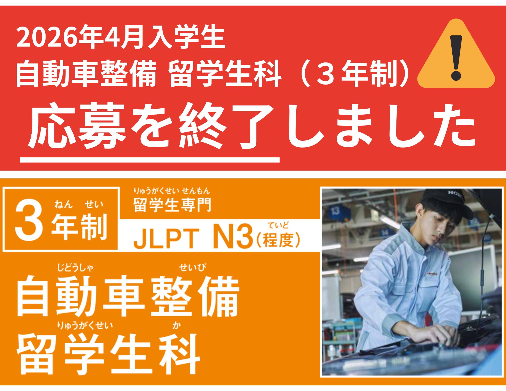 ご出願いただいた受験生の皆様、誠にありがとうございました。また、既に「自動車整備留学生科:3年制」は第2回入試をもって募集終了しました。なお、第3回入試をもって「自動車整備科:2年制」も募集を終了しました。多くの方に進学先としてお選びいただき、本当に感謝申し上げます。