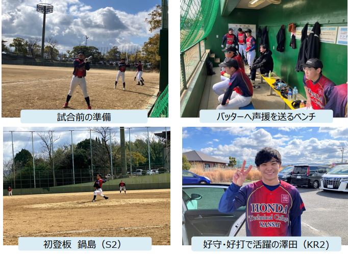 2月9日(日)に野球同好会が、今年度最後の大会となる大阪狭山市木下杯に出場しました。1回戦の相手は堺BEAT(2月)。寒空の中しっかりとウォーミングアップを行い試合開始。ホンダ学園の初回攻撃は、2アウトから3番山際さんがフォアボールで出塁すると、盗塁と相手のミスで3塁まで進み、先制のチャンスをつくるも4番山市さんがサードフライに倒れました。