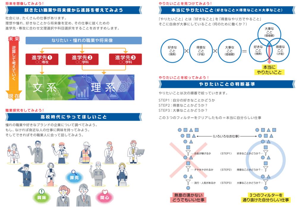 進路探究ノートの最終ページには、高校生向けの選べる4つの出張授業(無料)もご紹介してます。お申し込みは、学校単位・クラス単位で受け付けております。