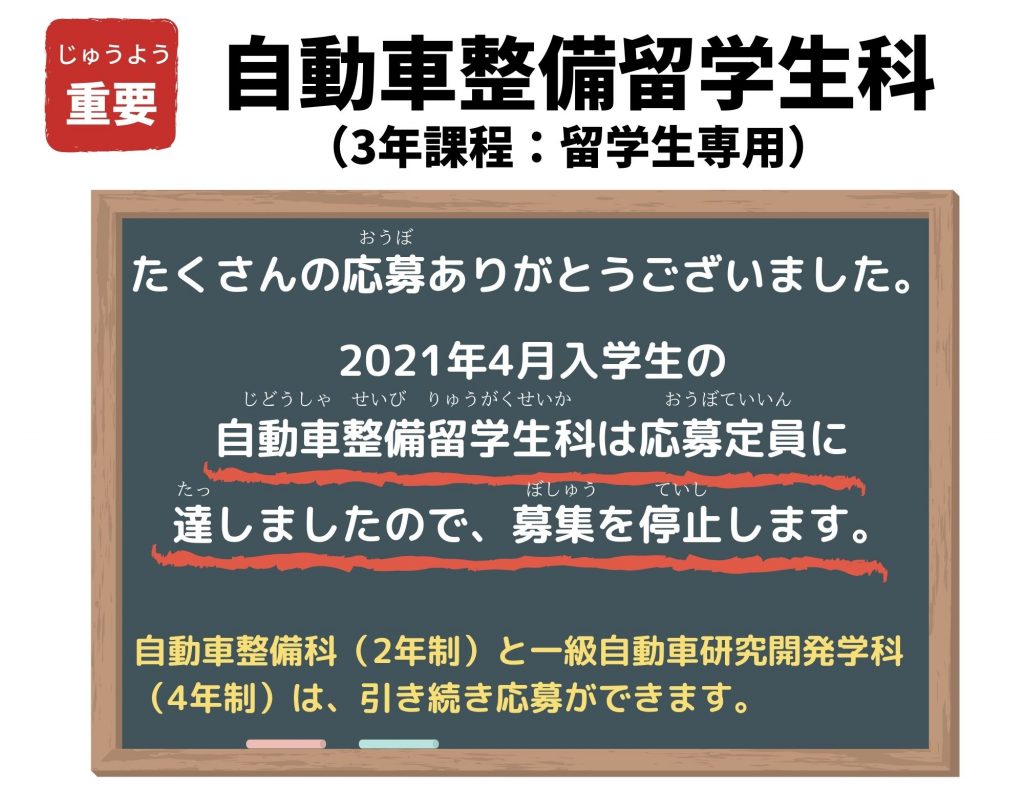 *「自動車整備留学生科(3年課程)」の入学手続き次第で、募集定員に欠員が生じた場合は、応募を再開することもあります。その際は、HPにて募集再開のご連絡をさせていただきます。