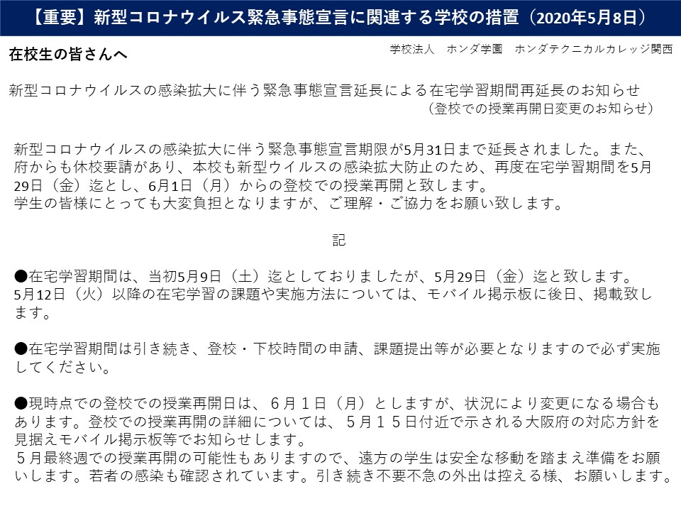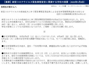 本校としては、このような状況下での5月12日(火)での登校による授業再開は困難と判断し、5月末までは引き続き「在宅での学習期間」とし、6月1日(月)より登校での授業再開(予定)と致します。