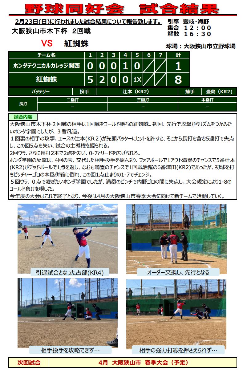 2月23日(日)に本校の野球同好会が、大阪狭山市木下杯2回戦の試合に臨みました。2回戦の相手は1回戦をコールド勝ちの紅蜘蛛。初回、先行で攻撃からリズムをつかみたいホンダ学園でしたが3者凡退。1回裏の相手の攻撃、エースの辻本さんが先頭バッターにヒットを許すと、そこから長打を含む5連打で失点し、この回5点を失い試合の主導権を握られる。