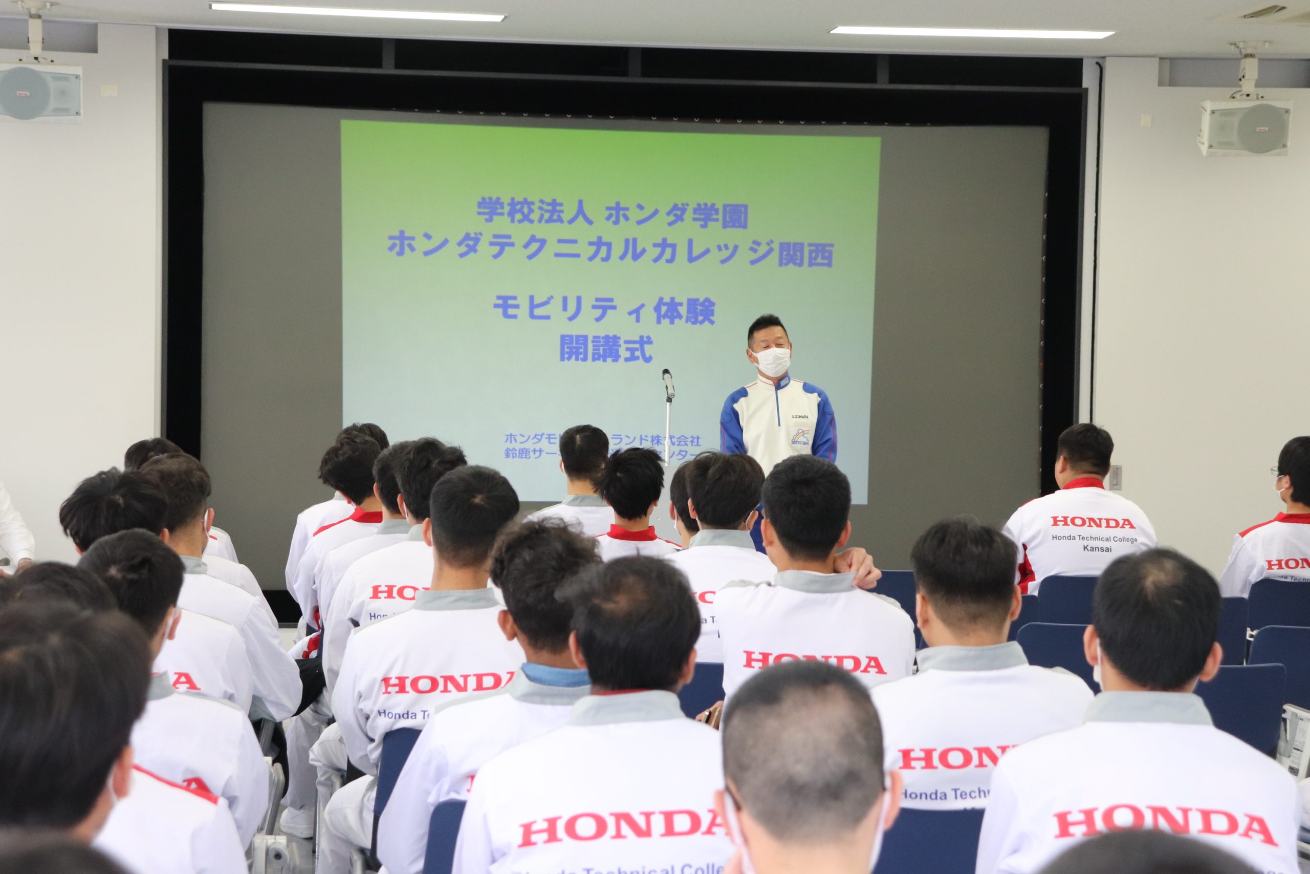 翌日の24日(月)は、鈴鹿サーキットに併設されている交通教育センターに移動し、モビリティの体験及びKYT(危険予知トレーニング)を実施し、モビリティを操る楽しさを体験するとともに潜在している危険についての理解を深めました。また、Hondaの自動車製造現場の鈴鹿製作所にも見学に行き、ものづくりの現場を実際に見て、自動車の製造過程についてもしっかり学んできました。この二日間のオリエンテーションで、モビリティへの興味関心が更に増し、新しい仲間も沢山できました。(#^^#)