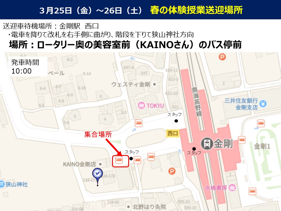 □学園の最寄り駅:金剛駅から送迎バス出します。金剛駅は急行停車駅で便利です。難波から急行で23分(乗車賃450円)