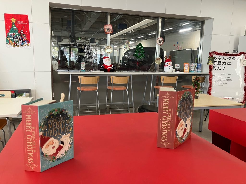 【飾り付け(ガーデニング同好会)】クリスマス仕様へ! 2023.12.11 ガーデニング同好会の学生が1F受付のショールームにクリスマスの飾り付けを実施してくれました。クリスマスの飾り付けは、すっかり風物詩として学園にも定着してます。雰囲気が出て、とてもいいですね。また、ショールームの展示車(NSX)の中にもしっかり飾り付けをしてくれてます。(#^^#) 季節やイベントを彩る飾り付け。これからも大切にしていきたいです。