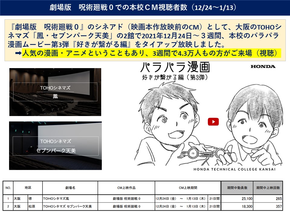 2021年12月24日~3週間、大阪のTOHOシネマズ鳳・セブンパーク天美の2館で『劇場版 呪術廻戦 0』のシネアド(本編が始まる前のCM)に本校のパラパラ漫画ムービー第3弾『好きが繋がる編』を放映いたしました。