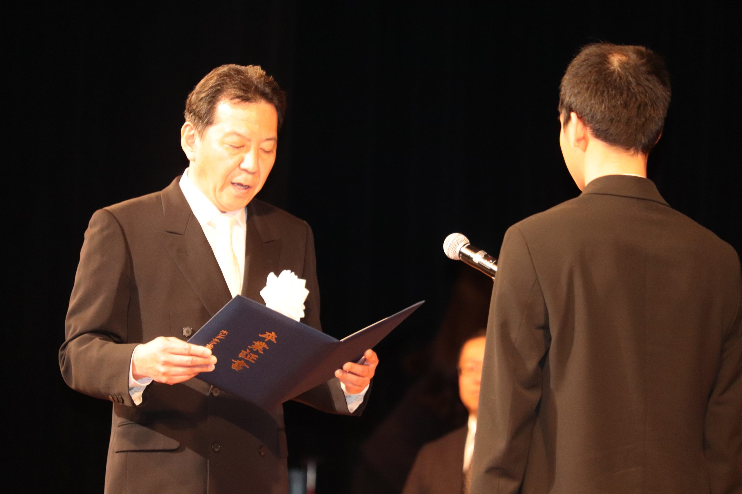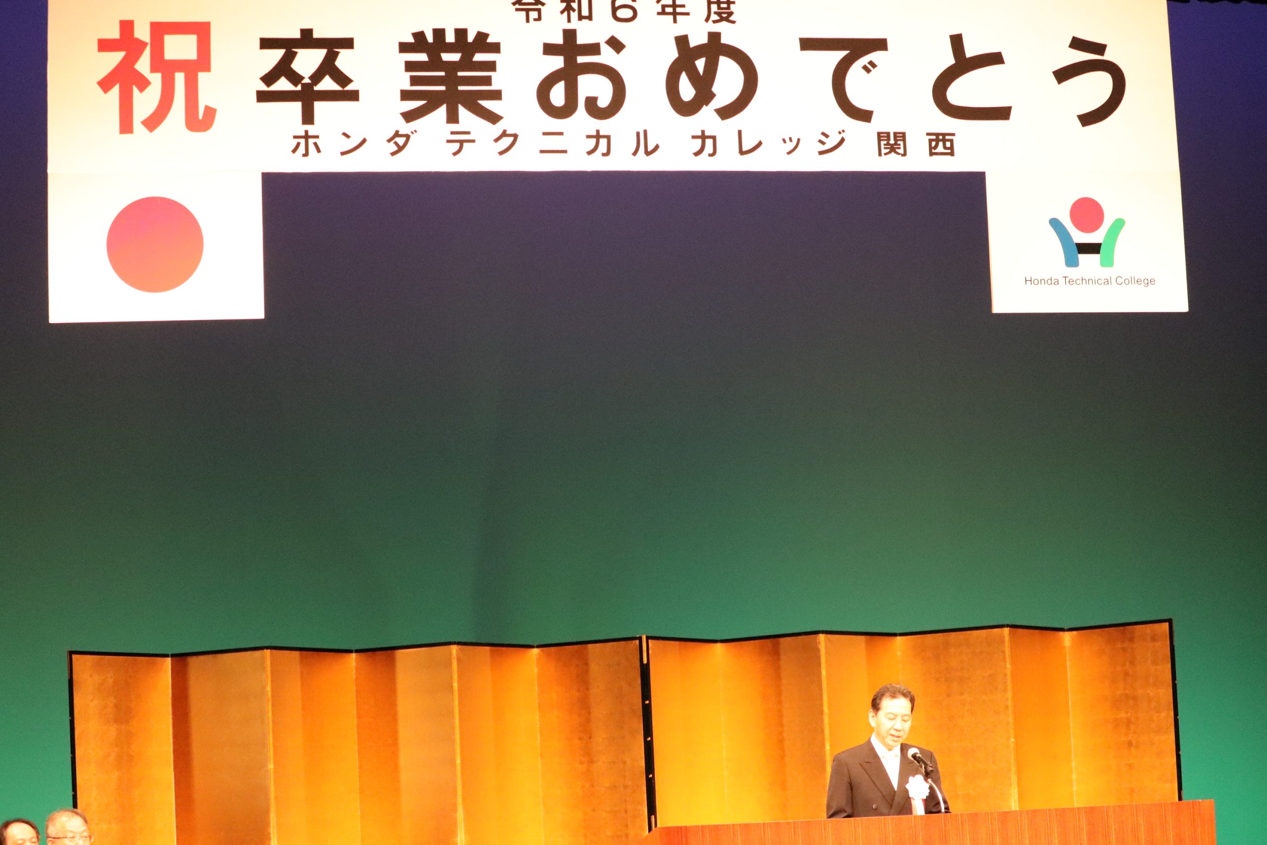 3月12日(水)に大阪狭山市にあるSAYAKAホールにて、令和6年度卒業式を執り行いました。卒業生は、自動車整備科54名、自動車整備留学生科34名、一級自動車研究開発学科53名、合計141名です。卒業式には、たくさんのご来賓、保護者様もご参列いただき、また式次第もコロナ前の状態にほぼ戻っております。その他、祝電ではサプライズで、Hondaのレーシングアンバサダーの方々からのビデオレターを放映し、卒業生・参列者、また、Youtubeで視聴していたご家族の皆様にも驚かれたものと思います。