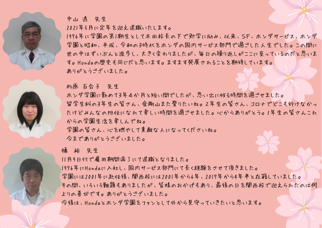 紙面に掲載できなかったご退任された先生方から学生の皆さんへのメッセージを頂いていますので、ご覧ください。