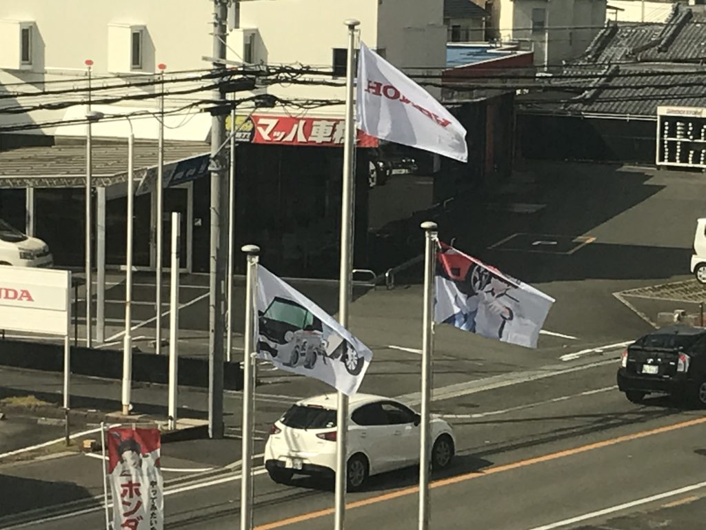 ホンダテクニカルカレッジ関西の正門付近に設置してある3連ポールに新たに教職員がデザインしたフラッグを設置しました。フラッグは①HONDA のロゴ ②同好会のレース車両とCub ③整備の授業風景の3つです。従来から道路フェンス付近に設置してある のぼりを含め、通行者・通行車両からもHondaの自動車大学校と気づかれやすくなるかと思います。付近をご通行された際は、新フラッグもご覧ください。
