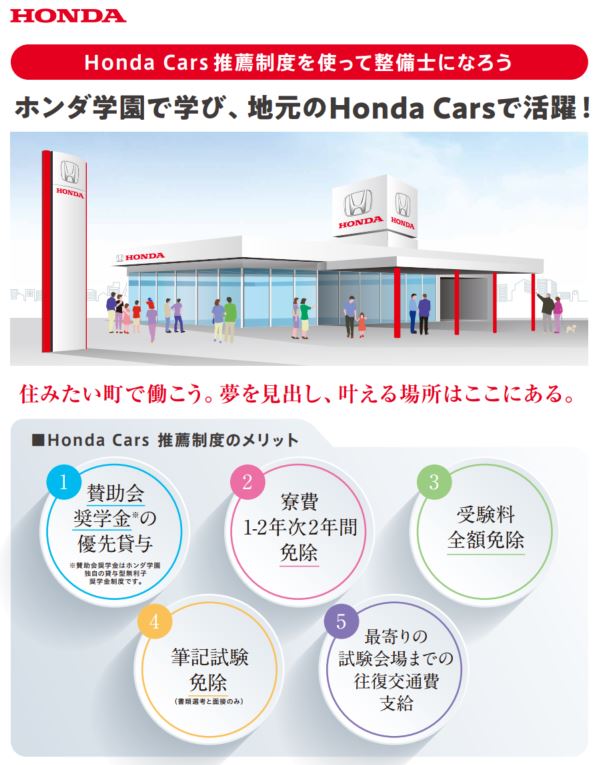 ホンダ学園の入試を受ける際、Honda Cars(ホンダ学園卒業後に就職する企業様)の代表者様から推薦をもらい、ホンダ学園に進学・卒業後(国家整備士資格を取得)、学園入試時にご推薦していただいたHonda Carsに就職する制度です。