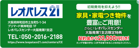 【新規提携 不動産会社!】レオパレス21でステキな家を探そう! 2024.08.02 この度、新たにレオパレス21様にご協力を頂き、提携不動産屋さんとして登録をさせて頂くこととなりました。 大阪南第一支店様限定で、学園生と入学予定者の皆さんは、なんと契約金から20,000円の特典付き! 契約はネットでも完結出来てしまうのですが、特典受け取りの為には、契約完了する前に必ず大阪南第1支店(050-2016-2188)までお電話頂きますようお願いします。 レオパレス21様は家具・家電つきの物件が豊富にあることが特徴です。 卒業したら地元に帰ることを考えている方などにはとても便利だと思います。 物件によってはルームシェアも可能とのことなので、お部屋探しの際はご検討下さい^^