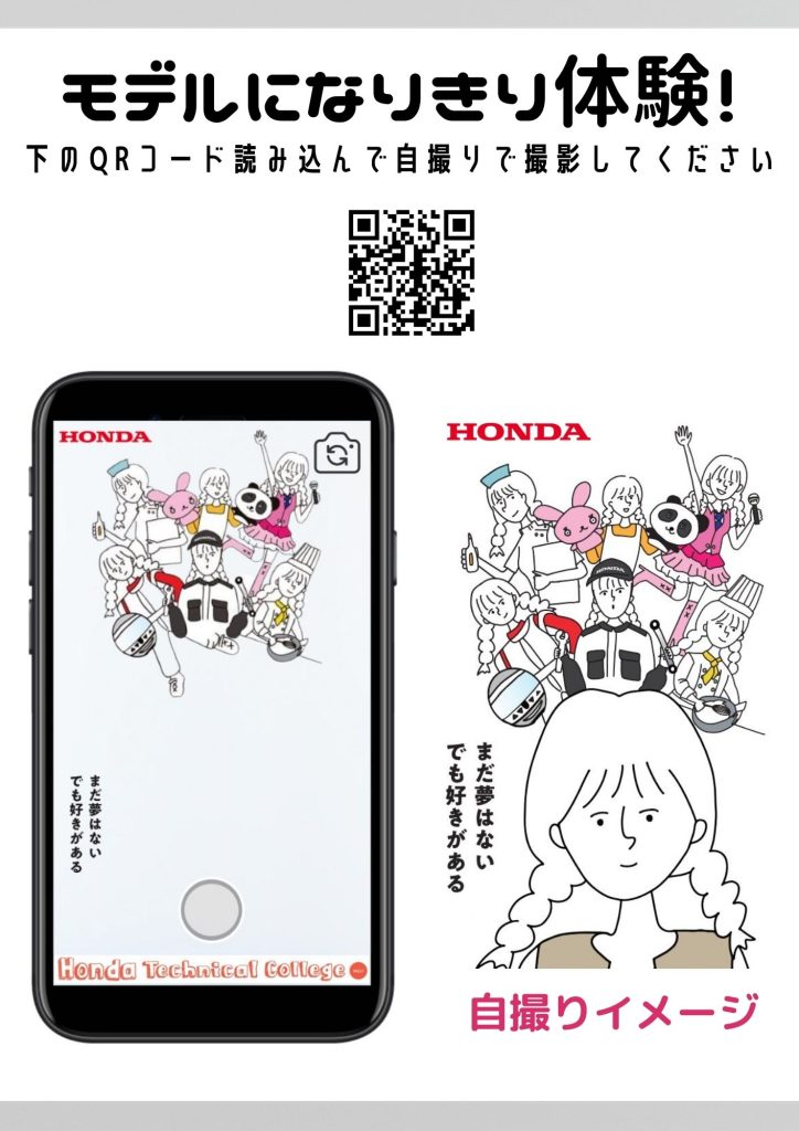 ホンダテクニカルカレッジ関西の2022年ポスターモデルになりきれる「ARを使って自撮り体験」をご準備しました。下図の専用QRコードを読み込んで自撮りで、ホンダテクニカルカレッジ関西のポスターモデルになりきってみませんか?(^^♪