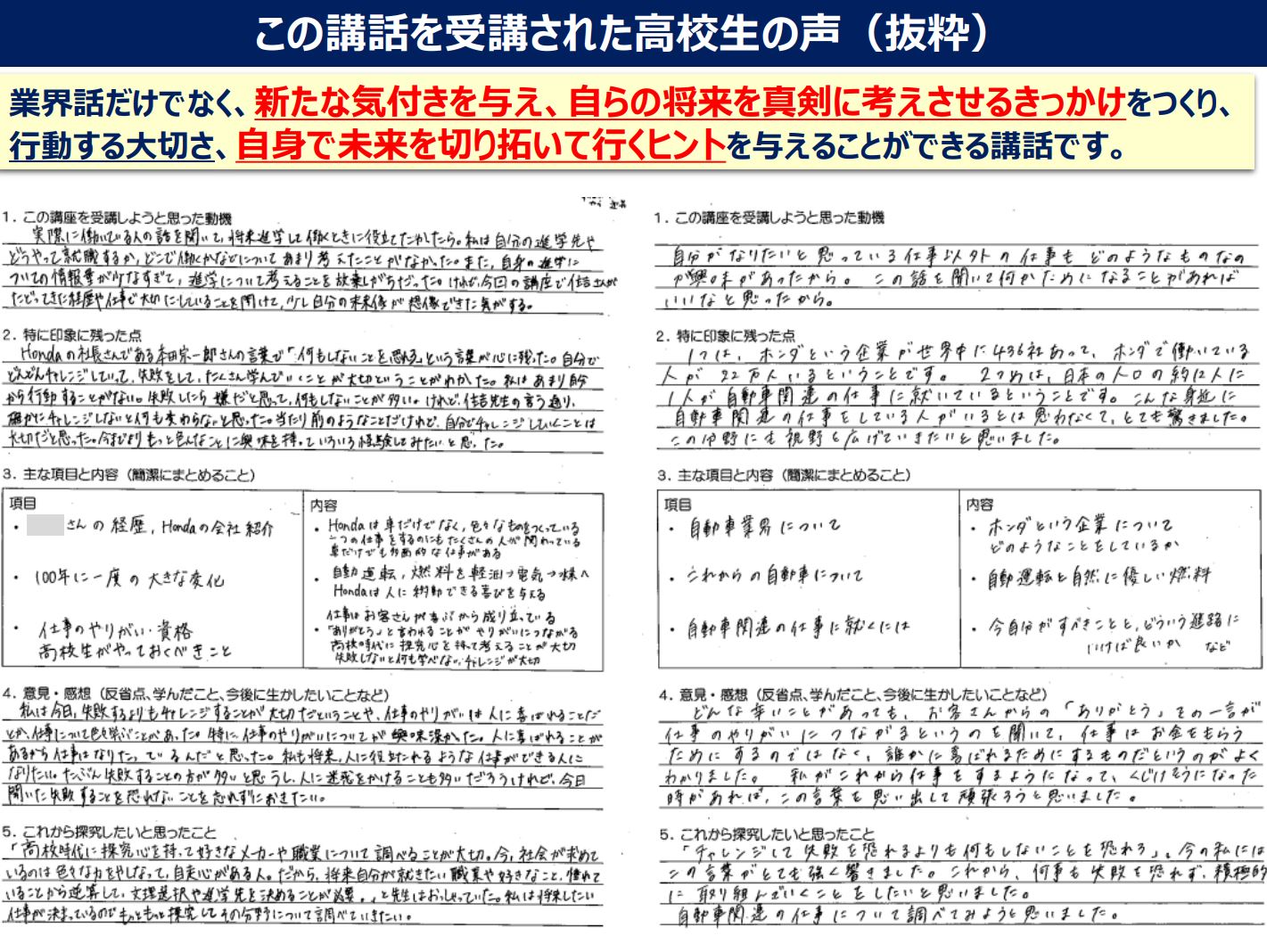 →受講された生徒様の感想文いただきました。生徒それぞれの思いや感想・決意にとても感心しました。この度は講話の開催、誠にありがとうございました。