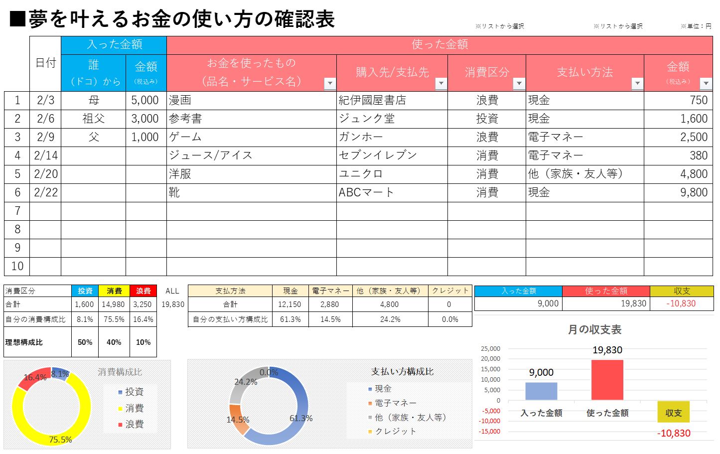 ■夢を叶えるお金の使い方授業の受講者様にはオリジナルの「夢を叶えるお金の管理表(エクセル)」無償提供