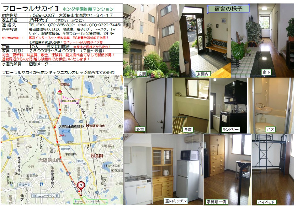 ホンダテクニカルカレッジ関西への進学にあたり、ひとり暮らしが必要な方にピッタリな新着の物件情報です。学園の最寄り駅:金剛駅から2駅(なんば方面)の狭山駅に近いマンションのご紹介です。物件は、家具・家電付き、高速インターネット無料。家賃は25,000 ~36,000円と非常にリーズナブルな物件です。大家さんも住んでいるから安心できますよ!詳しは下記の画像をクリックください。