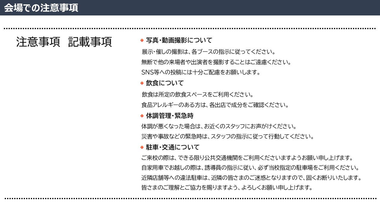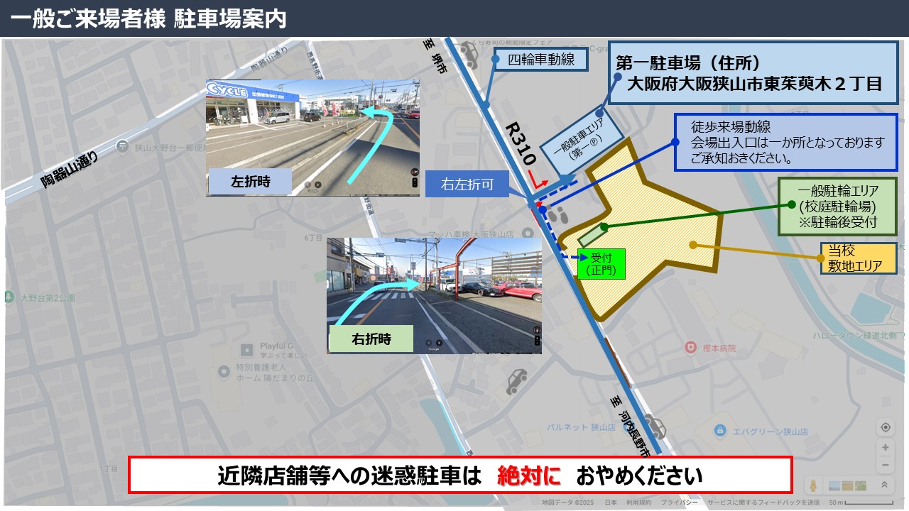 ※駐車台数に限りがございます。なるべく公共交通機関をお使いいただきご来校ください。また、近隣店舗への無断駐車は迷惑となりますので絶対におやめください。