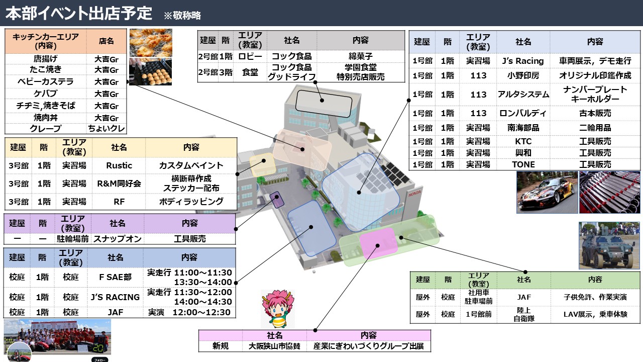 学園生、教職員が一緒になって、地域の皆様・小さなお子様にも楽しんでもらえるイベント内容にしました。当日は、レーシングマシンの展示・エンジン始動やキッチンカーも多数出展しますので、グルメも楽しめます。お友達、ご家族お誘いの上、ぜひ、ご来校ください。