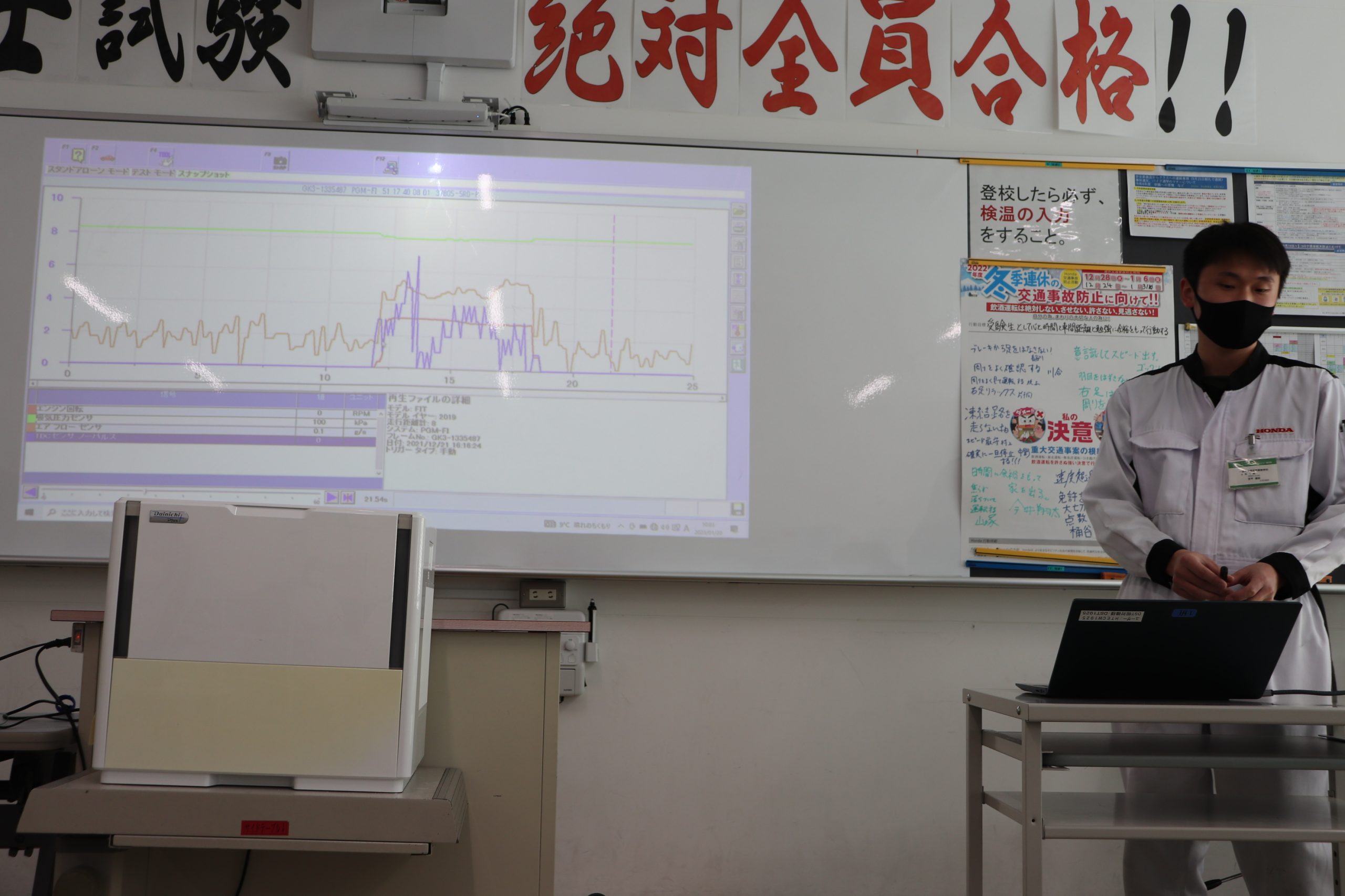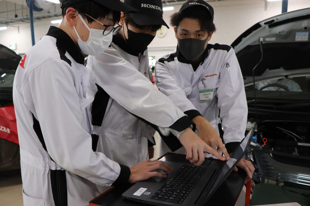 Hondaからの出張授業(サービス領域のツールと故障診断技術の習得) 2023.01.25 1月18日(水)~20日(金)の3日間、一級自動車研究開発学科 一級自動車整備士コース4年生を対象に、Hondaのサービス技術開発部門が製作している『サービスツール』とHonda Cars(四輪販売店)で実際に使用している『Honda車専用の故障診断器』を使った、診断手法とデータ分析及び実習授業を実施していただきました。 Hondaの関係者様、診断技術についての特別授業にご協力いただき、誠にありがとうございました。