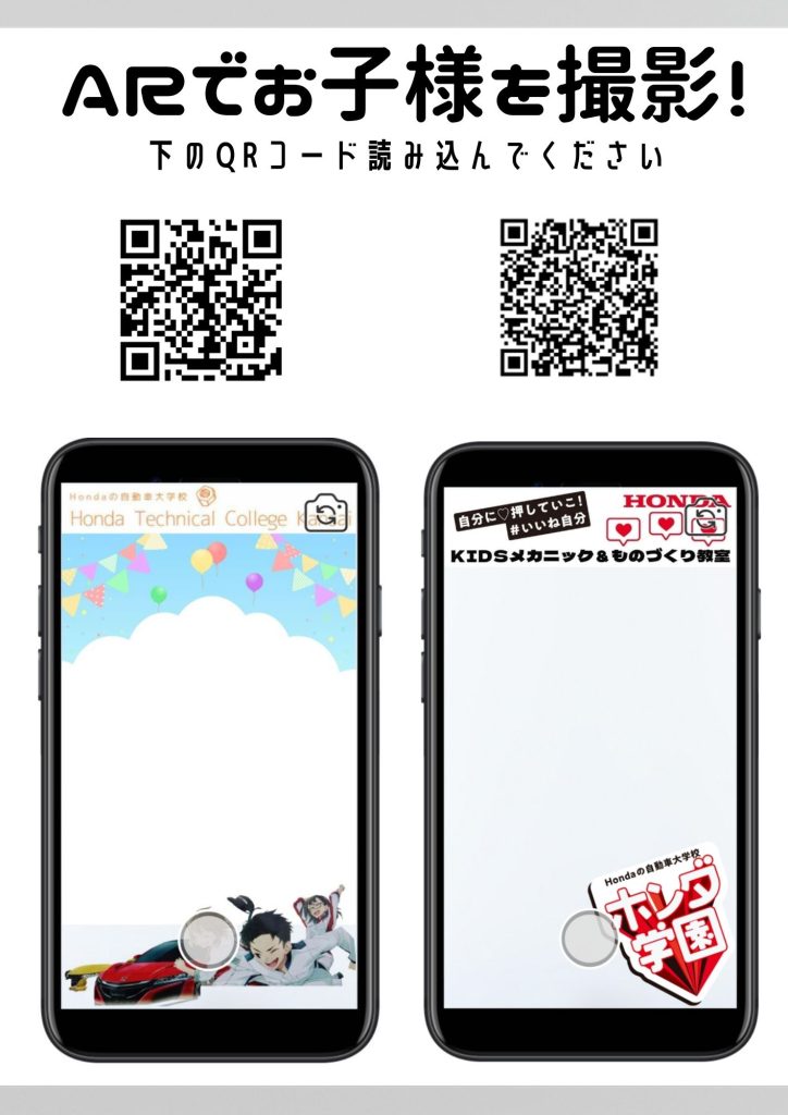 ・参加者の体験授業中の写真・動画撮影を行います。撮影した写真・動画は、ホンダ学園の公式サイト(HP/SNS)やKIDSメカニック体験の募集受付Webサイトに掲載をさせて頂きます。予め、ご理解・ご了承の程よろしくお願いします。